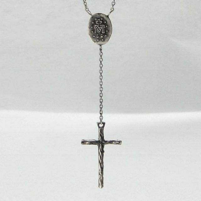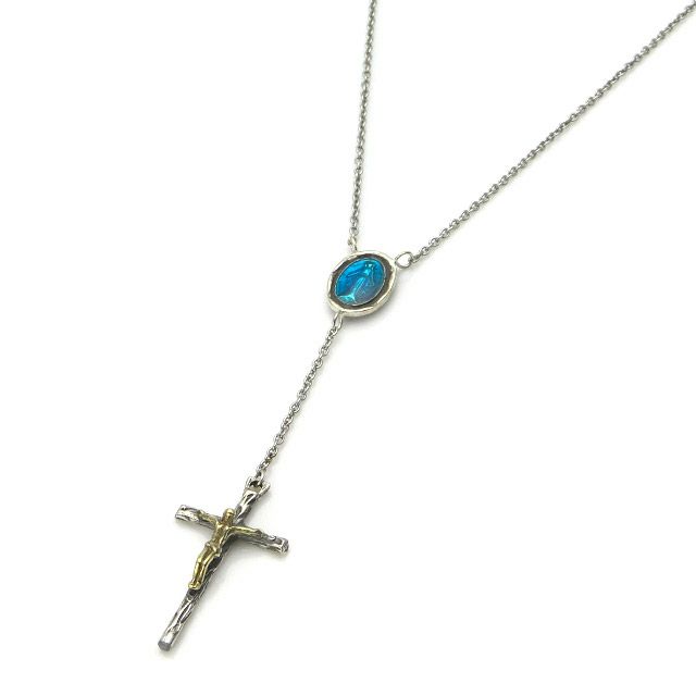 ブルーに染められたシルバーのマリアメダイとシルバーのクロスに磔られたブラスのキリストを組み上げたロザリオネックレスになります。