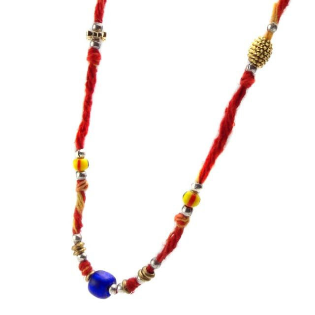 鮮やかな赤色のヒモに、メタルやガラスのビーズを組み合わせたカラーリングが目を惹くネックレス。トップにくる青いガラスビーズが全体を引き締めます。多重巻にして、ブレスレットやアンクレットなどにもご使用頂けます。