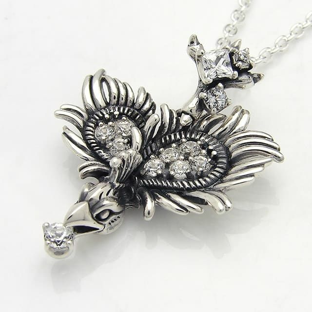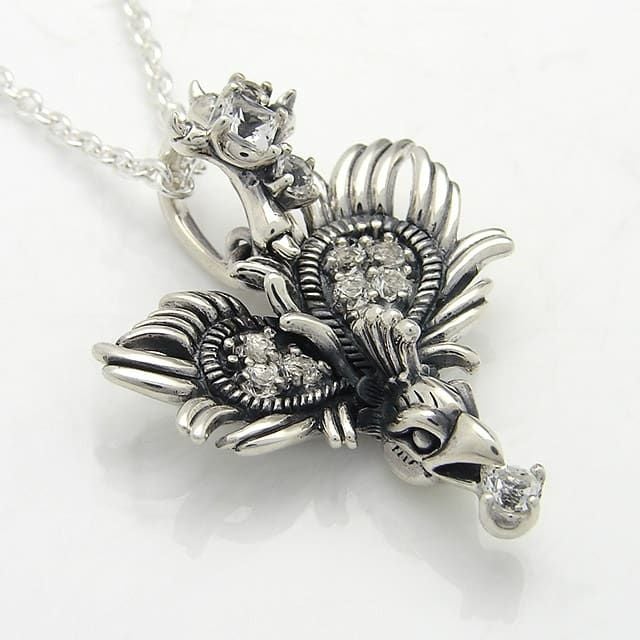 孔雀の羽でハートを形取ったペンダント。小振りな中でも石の輝きが生み出す高級感と上品さのあるアイテムです。