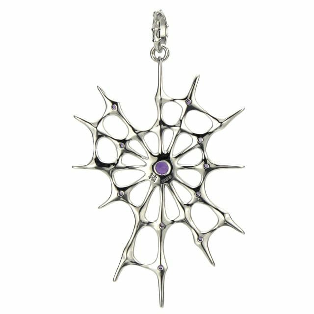 水滴がついた蜘蛛の巣をデザインソースに描いた作品。命の輝きを石で表現しており、命の連鎖を感じさせるアイテム。
