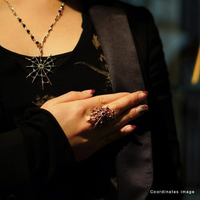 蜘蛛の巣がモチーフのリング。サイズは大きいですが透かしのデザインなので着けやすく、指先に華を添えてくれます。