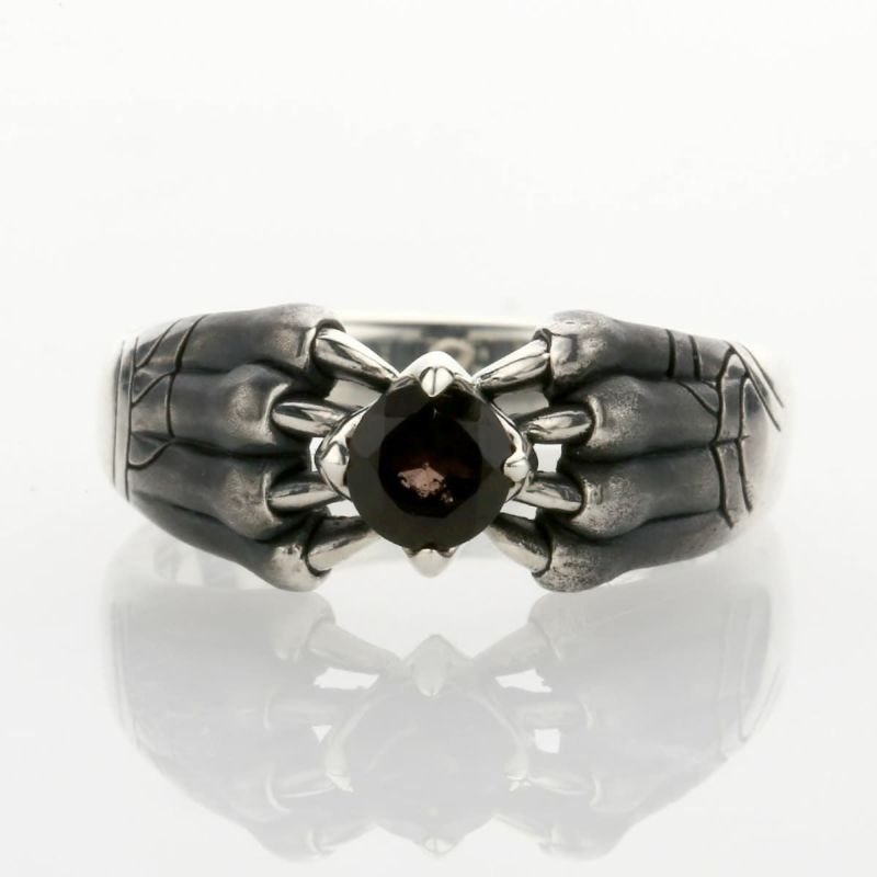 中央に大粒のスモーキークォーツを配したリング。岩の影から生まれた宝石を守る幻影は、裏側に肉球があり猫科の前足のような風貌。
