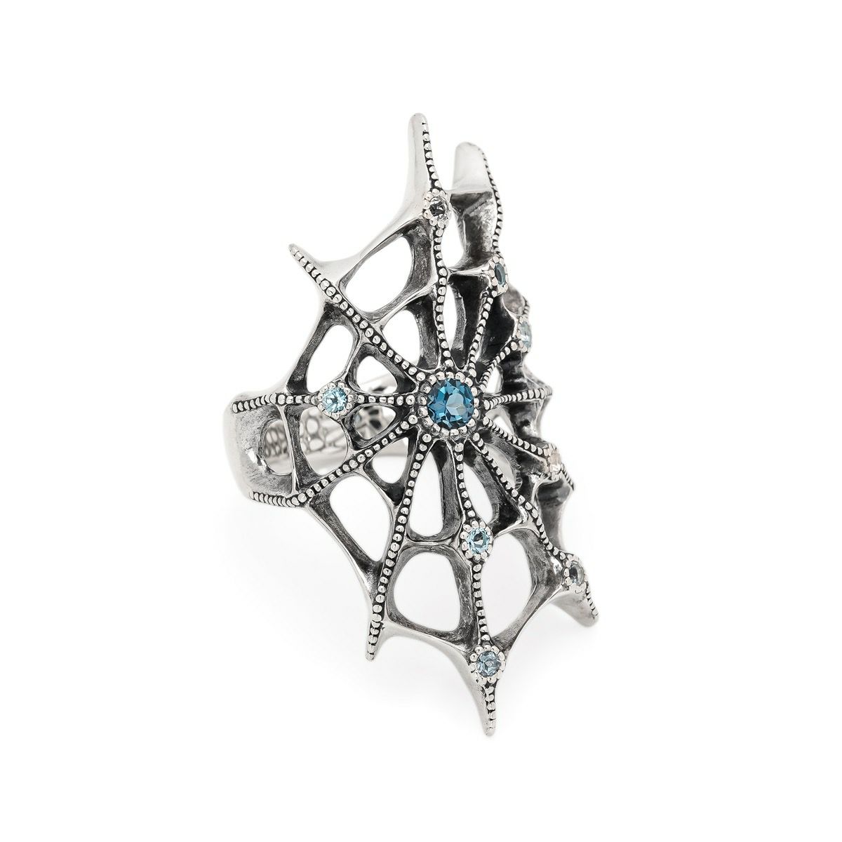 蜘蛛の巣がモチーフのリング。サイズは大きいですが透かしのデザインなので着けやすく、指先に華を添えてくれます。
