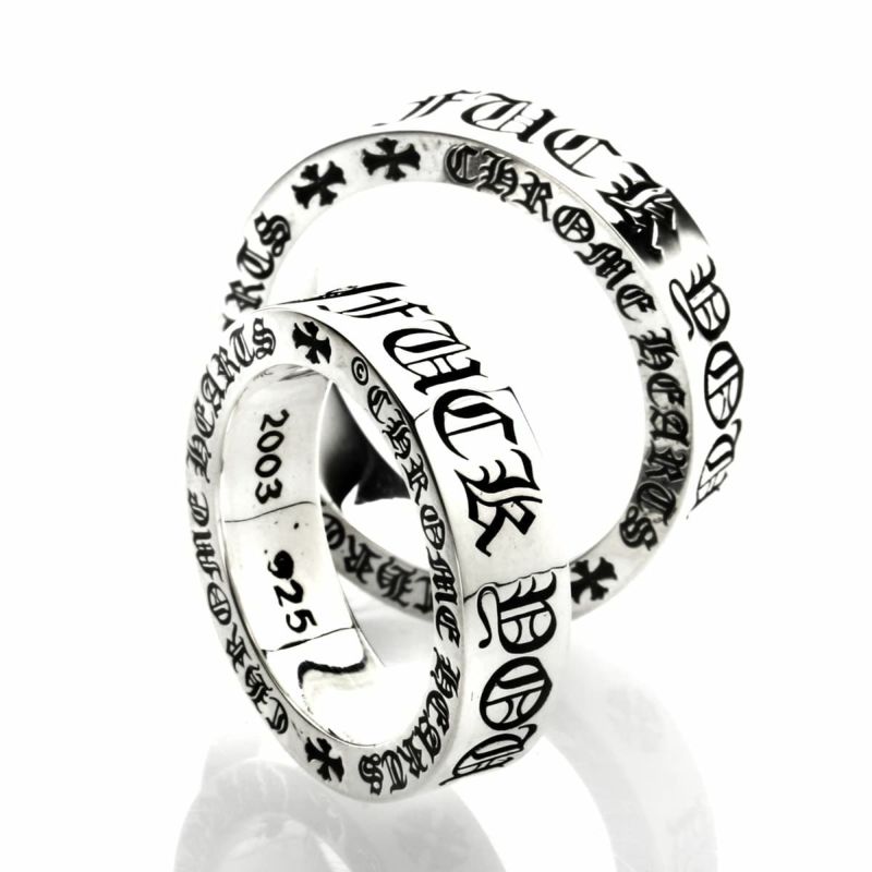このリングはノーマル6mmスペーサーリングの側面にFuckyouと意味深い文字が彫られている。※リング側面の刻印デザインに関しましてこちらの商品のリング側面の刻印はリングサイズにより画像とデザインが異なる場合があります。