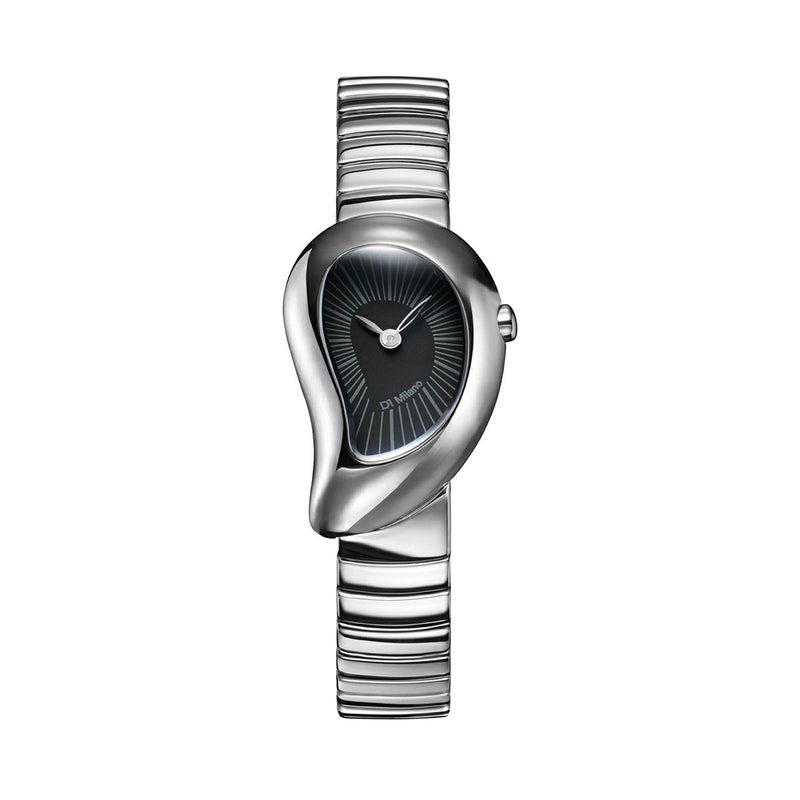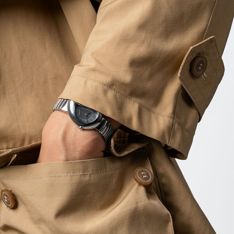 “DROP(雫)”という名の通り、液体が流れ落ちる瞬間をデザインコンセプトにした新コレクション。ケースはステンレススチールを有機的に成形し、エッジを極限まで削ぎ落とした立体的なシルエットが特徴です。従来の直線的なケース構造とは異なり、曲線と陰影で造形を描くことで、手首に自然に沿う柔らかなフォルムを実現しました。23mm径のコンパクトなケースサイズながら、立体的なボリュームが存在感を放ち、まるでブレスレットのようにスタイルに溶け込みます。サファイアガラス(ブルー無反射コーティング)を採用し、ジュエリー感覚で楽しめる3モデルがラインナップ。金属が溶けて流れるような質感を追求することで、時計とジュエリーの中間のような有機的シルエットを創り出しました。「時計」と「ブレスレット」の境界を曖昧にしながら、静かに、しかし確実に印象を刻むプロダクトとして完成しました。