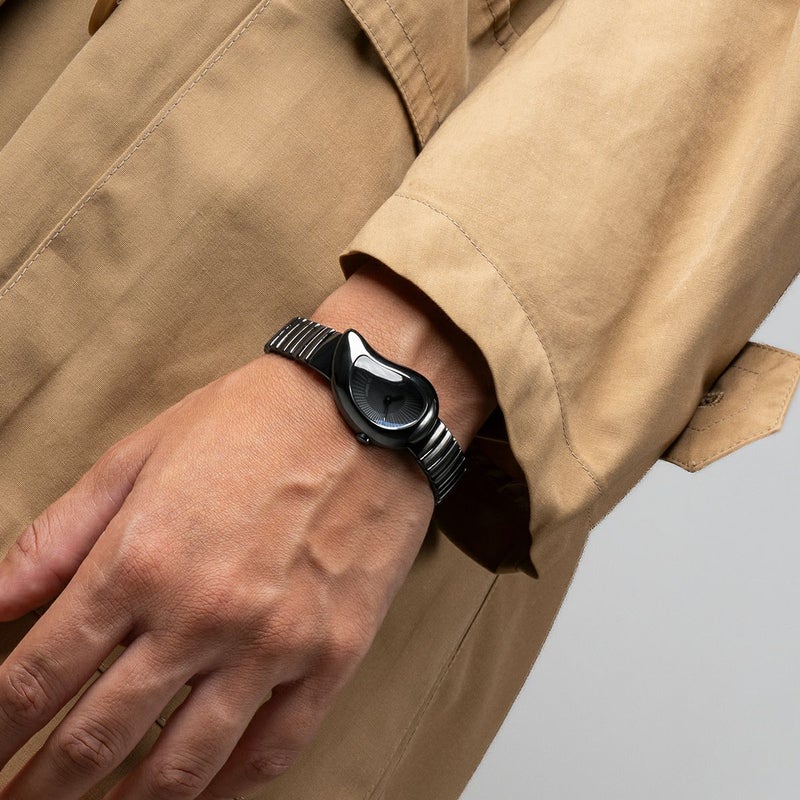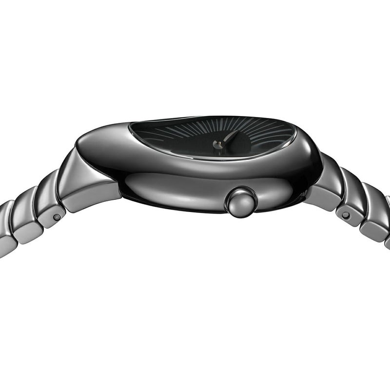 “DROP(雫)”という名の通り、液体が流れ落ちる瞬間をデザインコンセプトにした新コレクション。ケースはステンレススチールを有機的に成形し、エッジを極限まで削ぎ落とした立体的なシルエットが特徴です。従来の直線的なケース構造とは異なり、曲線と陰影で造形を描くことで、手首に自然に沿う柔らかなフォルムを実現しました。23mm径のコンパクトなケースサイズながら、立体的なボリュームが存在感を放ち、まるでブレスレットのようにスタイルに溶け込みます。サファイアガラス(ブルー無反射コーティング)を採用し、ジュエリー感覚で楽しめる3モデルがラインナップ。金属が溶けて流れるような質感を追求することで、時計とジュエリーの中間のような有機的シルエットを創り出しました。「時計」と「ブレスレット」の境界を曖昧にしながら、静かに、しかし確実に印象を刻むプロダクトとして完成しました。
