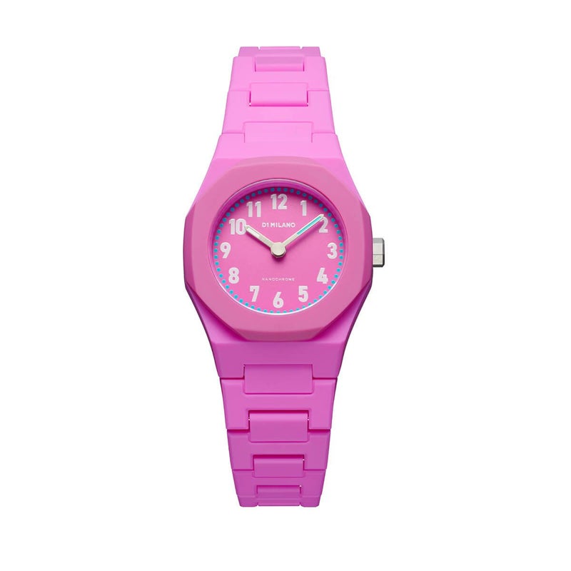 ワントーンのソフトタッチケースとストラップをベースに、視認性の高いアラビア数字のインデックスと分刻みのポイントマーカーを配置。ベースカラーとは対照的な色をポイントマーカーに施すことで、遊び心のあるデザインとなっている。