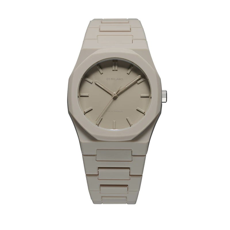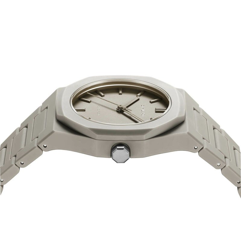 生地や布地の自然な色合いを表現した淡いベージュカラーの「エクリュ」は、ケース、ストラップ、文字盤、立体的なバーインデックス、ハンズの全てのパーツをマットなワンカラーで統一。この一色に染められたパーツの組み合わせだけで個性を演出し、独自のスタイルを表現するため、単なる色味の選定ではなく洗練され拘り抜かれたカラーをチョイスした。