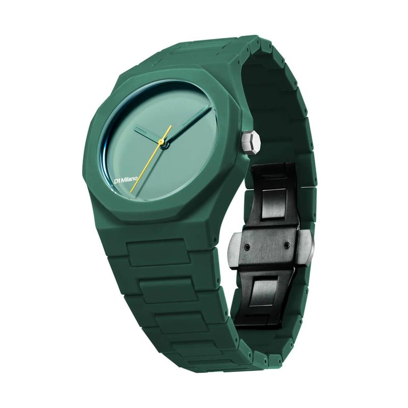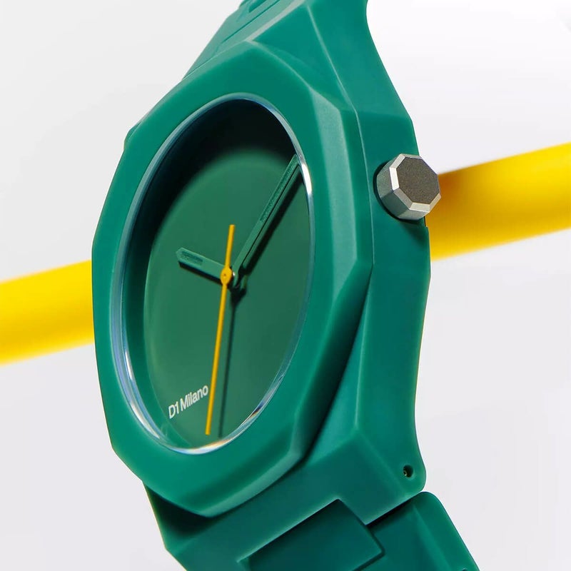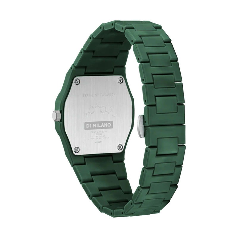 「ポリカーボン」コレクションの新作は、37mmケースのシンプルなデザインに、軽量で耐久性のあるポリカーボネート素材を採用し、ソフトタッチ仕上げで上品な風合いを実現。カラーバリエーションはブラック、グレー、ブルー、グリーンの4色展開で、文字盤と対照的な配色の秒針が視認性を高めると同時に、モダンな表情を加えています。ユニセックスでお使いいただけ、日常の様々なシーンで幅広く活躍する一品です。日本製クォーツムーブメント。5気圧防水。