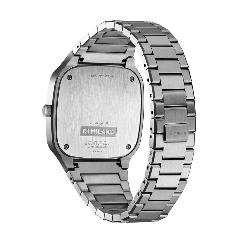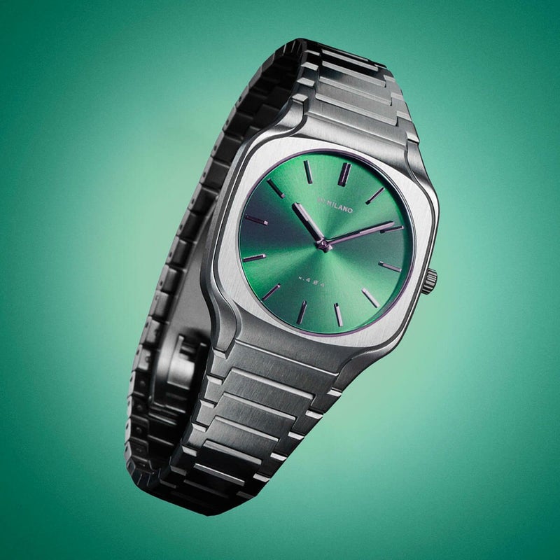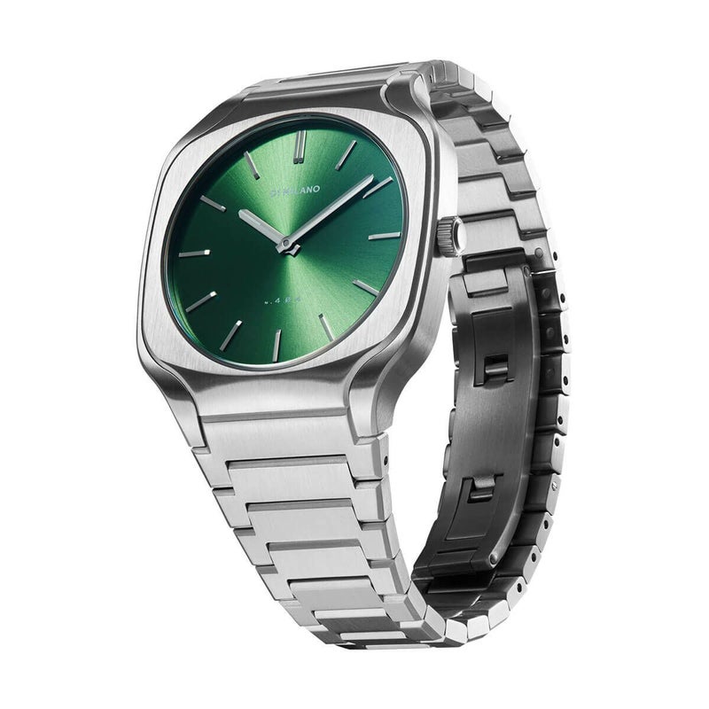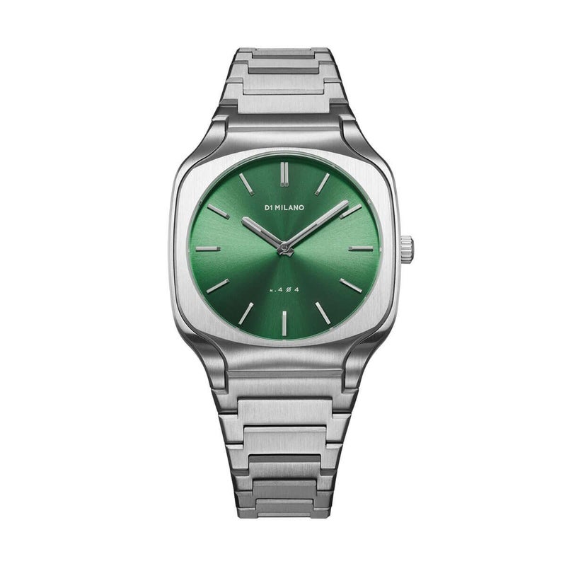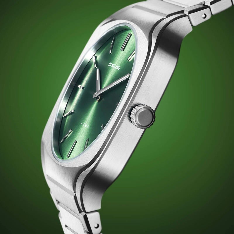 ヴィンテージの世界に直接インスパイアされ、クラシックで象徴的な特徴を、若々しくモダンなディテールと組み合わせることで、私たちのコレクションにユニークなスクエア・シェイプを生み出しました。 スクエアのケースが全体のデザインに独特のタッチを加え、個性と現代的なファッション性を醸し出しています。調和のとれたバランスの37mmサイズは、フォーマルなシーンにも普段使いにも幅広くお使いいただけます。シルバーのステンレススティール製ケースは、洗練された外観を保ちながら、時計の耐久性を高めています。 魅惑的なソレイユ仕上げが施された深いグリーンの文字盤は、神秘的で洗練されたタッチを添えています。単なる時計ではなく、会話が弾むことでしょう。エデン・グリーン・スクエアは、モダンさとクラシックな魅力が見事に融合したモデルです。 D1 Milanoとともに、非日常を受け入れ、瞬間をつかみましょう。