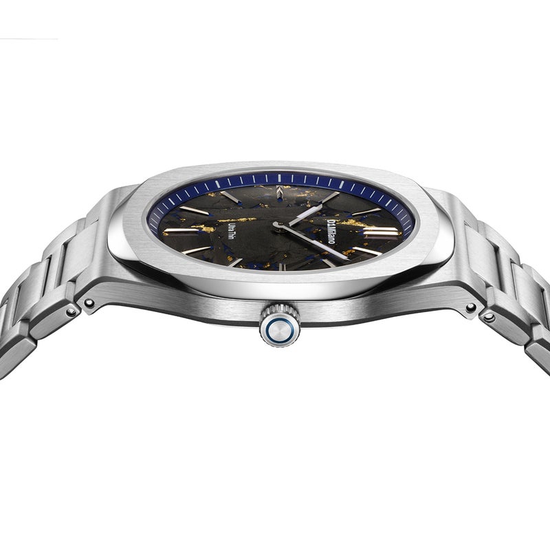 ブルーのブラスダイヤルに走るゴールドのニュアンスは、日本の伝統技法「金継ぎ」に着想を得たデザイン。欠けたものを美として蘇らせるという思想をモチーフに、ダイヤルに独特の奥行きを与えています。