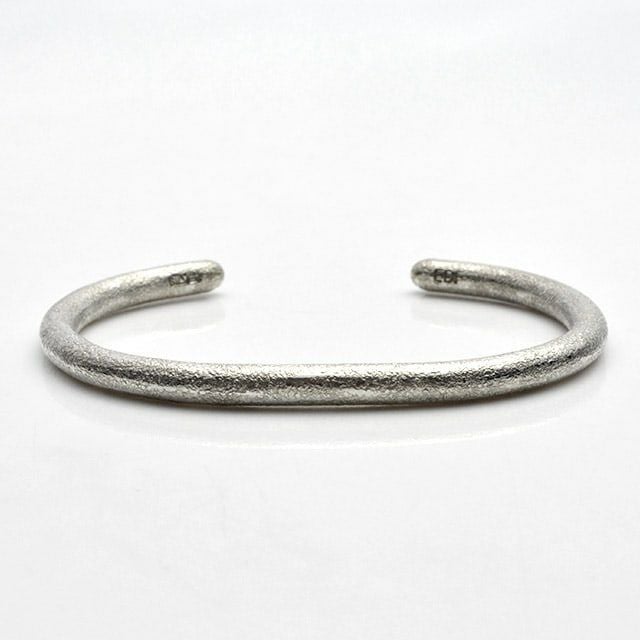 岩の様なテクスチャを加えたシンプルな円柱のバングル。控えめなポジションで、確かな存在感と鈍い輝きを放ちます。