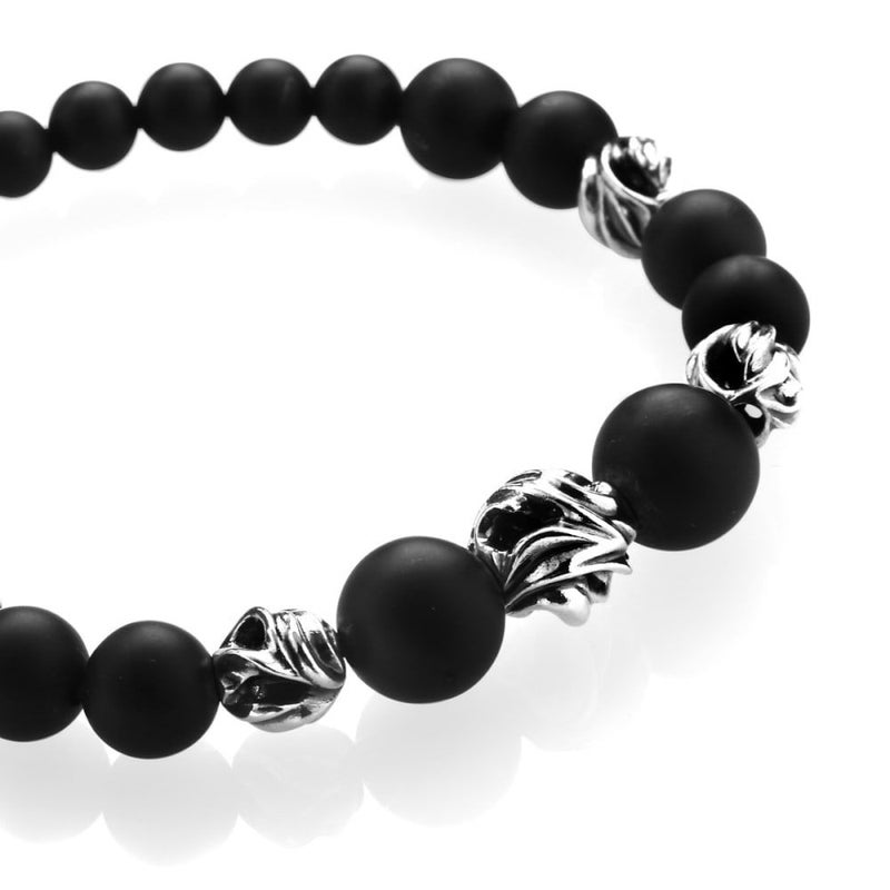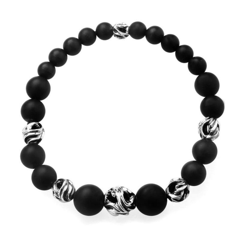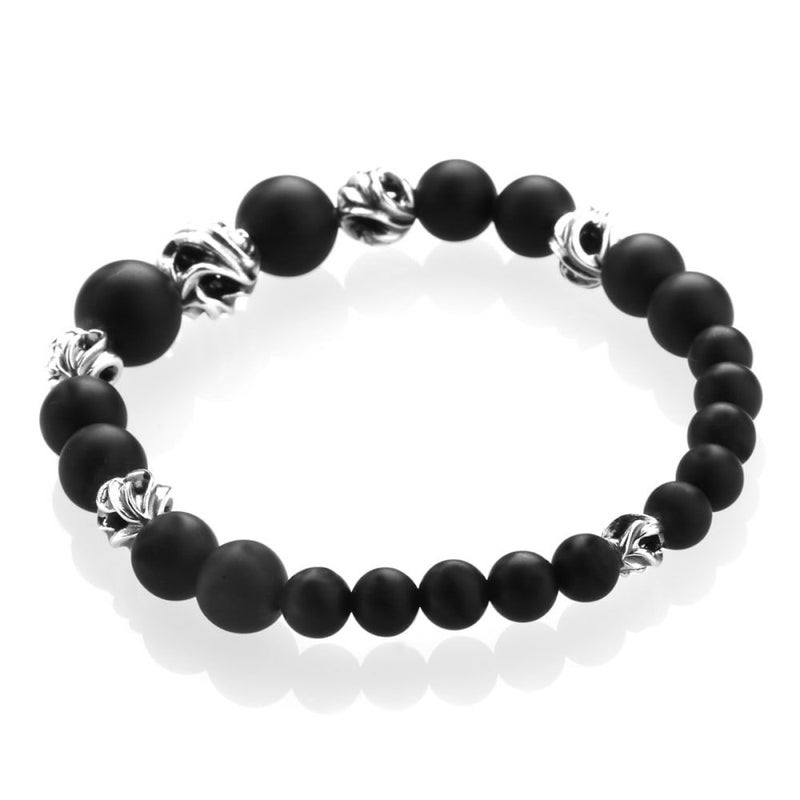 時に鋭く、時に滑らかに、それぞれのラインが交差し絡み合った瞬間、ひとつの形がうまれる。マットのオニキスと透かし玉を交互に配す事により輝きに動きがあるよう表現したブレスレット。