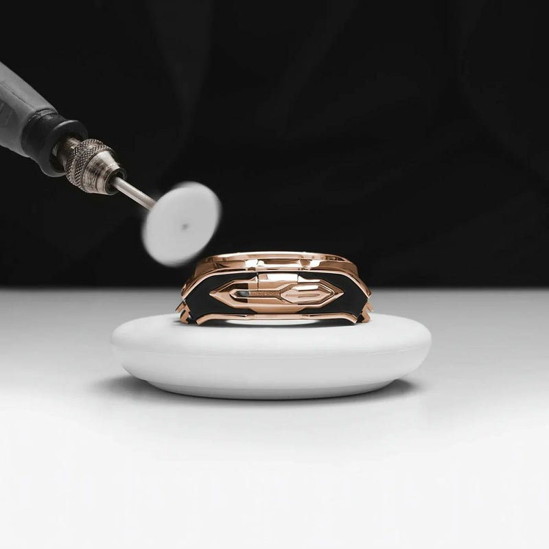 マットなカーボン仕上げと手作業で磨かれたチタンディテールにより、スポーティでエレガントな印象を与えます。