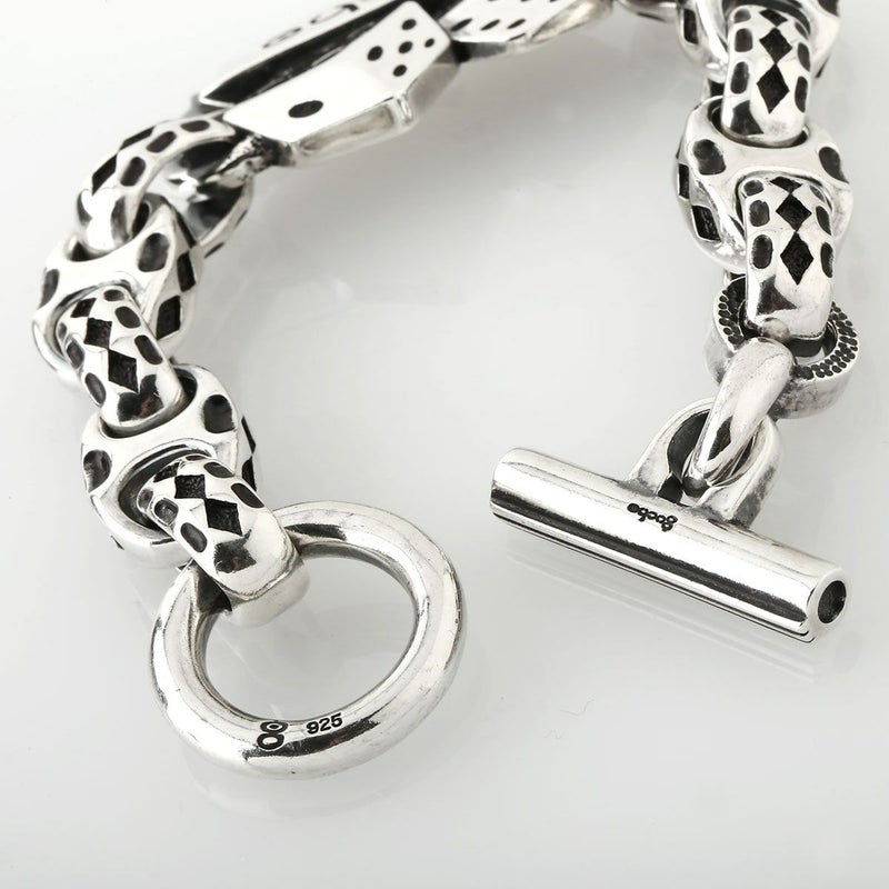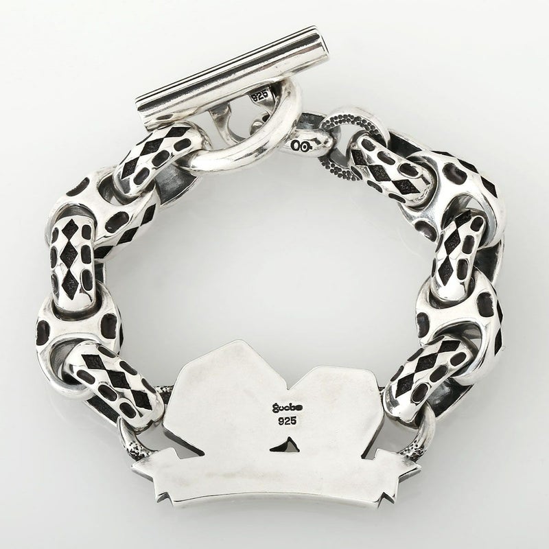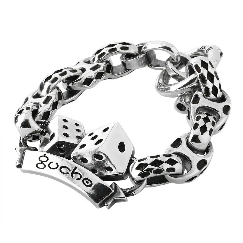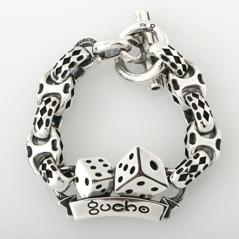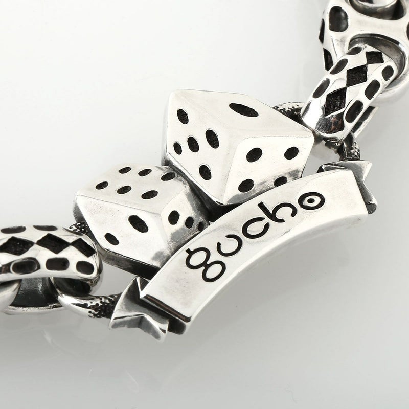 新作リリースとなるブレスレットは、久々にNEWリンク・パーツを作成・使用した、初期からのGUCHOのPOPさが前面に出た仕様は、非常にらしい仕上がりであり、前評判も非常に高い作品です。今回の「GOOD LUCK」なテーマにもあった、「DICE」を用いたブレスレットは以前からあるペンダントやリング、キーパーに続く作品で、「2.5D」の技法で表現されているため、板モノらしく厚みを感じさせない作りの「着けやすさ」と同時に、モチーフそのもののファッション性の高さが魅力の作品に仕上がっています。