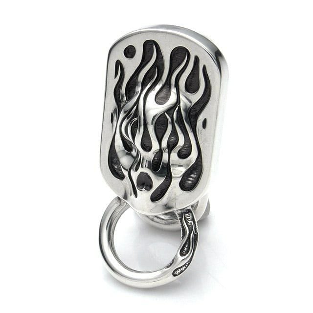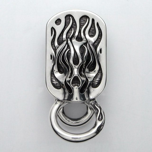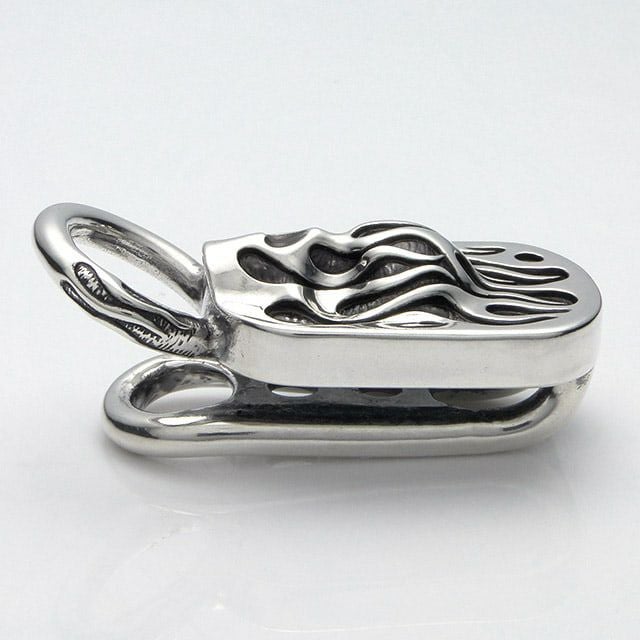 全面にファイヤーパターンがデザインされた、まさに「炎の壁」のようなベルトキーパー。ベルトに引っ掛けてウォレットチェーンや鍵を取り付けられます。