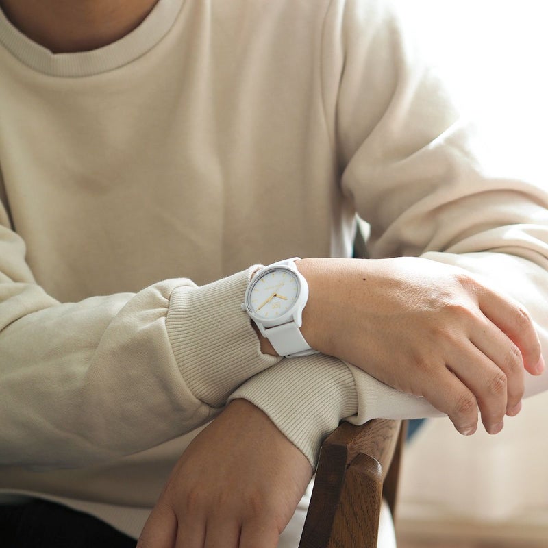 待望のミディアムサイズ(ケース径40mm)が発売となり、現在販売中のスモールサイズと合わせてペアウォッチとしての着用が可能に。既存モデルと比べるとちょっとした違いではあるが、このほんの少しの差別化があることで、痒い所に手が届くような幅の広い圧倒的なバリエーションを生み出している。電池交換不要のエコな日本製ソーラームーブメント。柔らかなシリコンラバーベルト。裏蓋やバックルは金属パーツ不使用で肌に優しい素材。5気圧防水。リサイクルフェルトパッケージ付属。