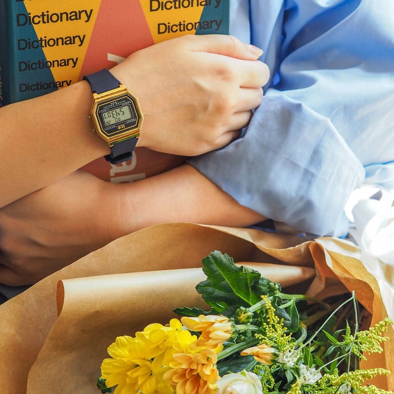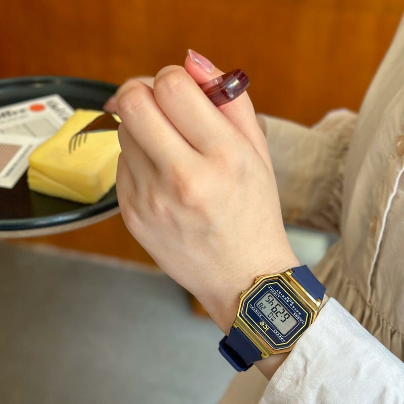 「アイス デジットレトロ」はその名の通り流線的な八角形のレトロなデザインが特徴。現代風にアレンジを加え、イエローゴールドのベゼルとプリントをアクセントに、文字盤とベルトのカラーを合わせたスタイリッシュな印象に。ケースは軽量で薄型のプラスチックプレート、風防は透明性と耐衝撃性に優れたアクリルガラス、ストラップは肌なじみがよく柔らかいブランドの代名詞ともいえるシリコンラバーを採用。ケース径32mm。3気圧防水。時刻、日付、曜日の表示に加え、ストップウォッチ、アラーム、バックライト、デュアルタイムの機能付き。