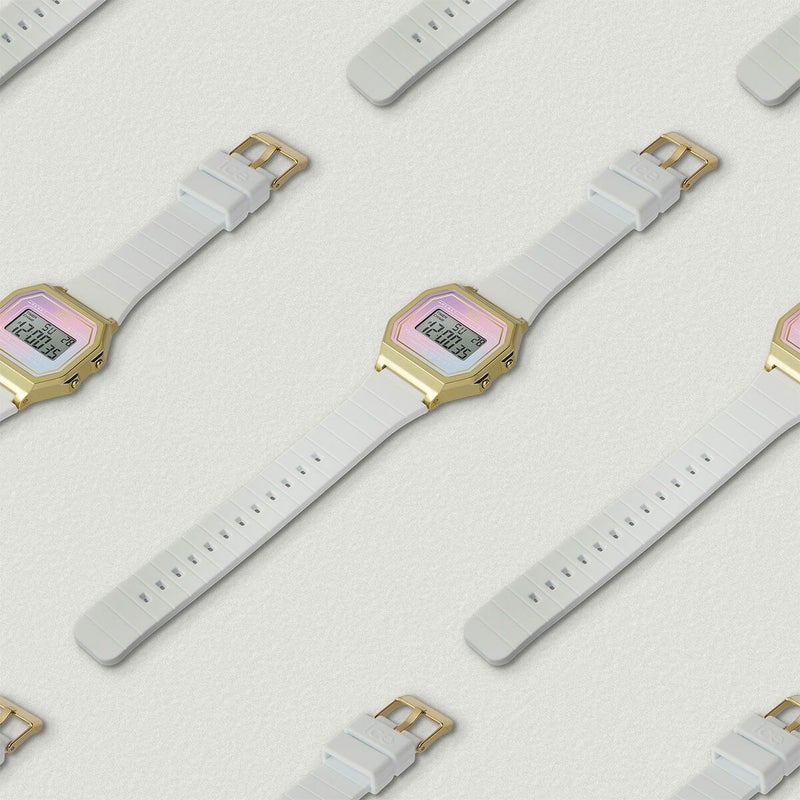 「アイスデジットレトロサンセット(ICE digit retro sunset)」は、2023年に登場した「アイスデジットレトロ」の文字盤に、春らしい柔らかな色味のピンクやブルー、パープルのグラデーションで施したモデル。それぞれのカラーに合わせた単色のストラップを備えたモデルと、文字盤のカラーがより際立つホワイトのストラップを組み合わせた。ケースは軽量で薄型のプラスチックプレート、風防は透明性と耐衝撃性に優れたアクリルガラス、ストラップは肌なじみが良く柔らかなブランドの代名詞ともいえるシリコンラバーを採用している。