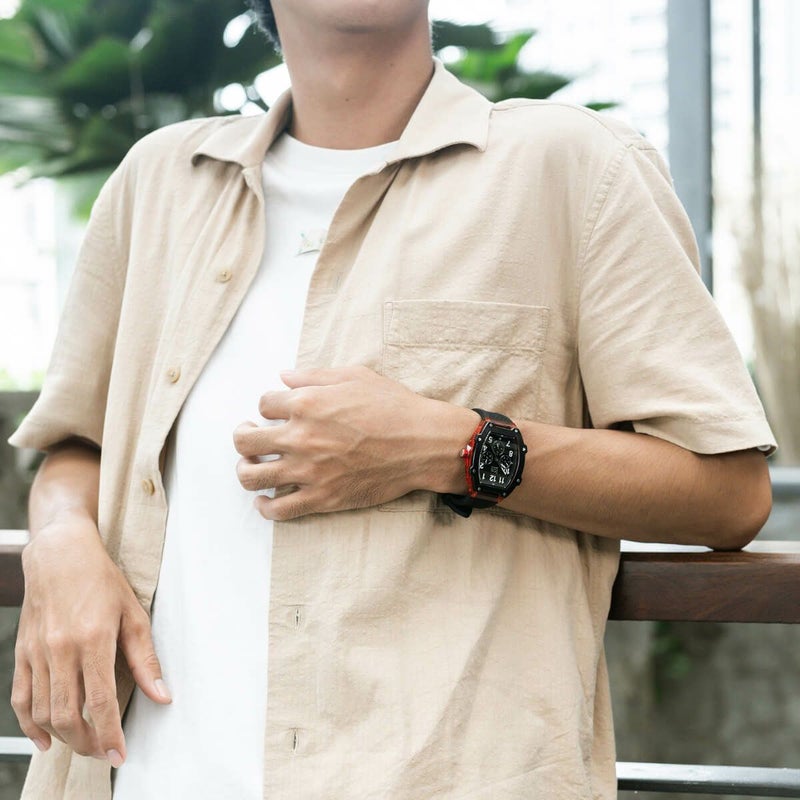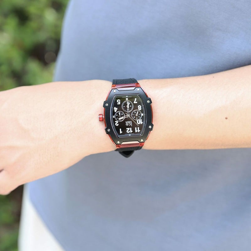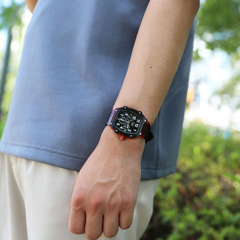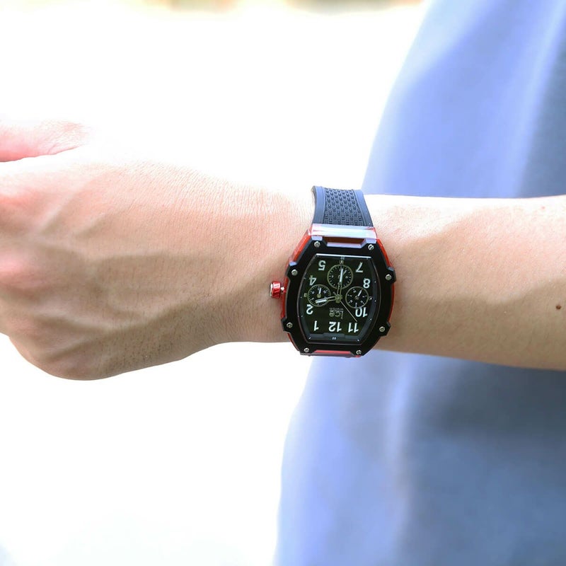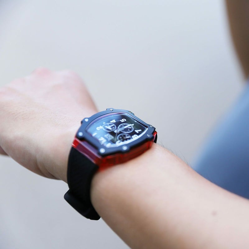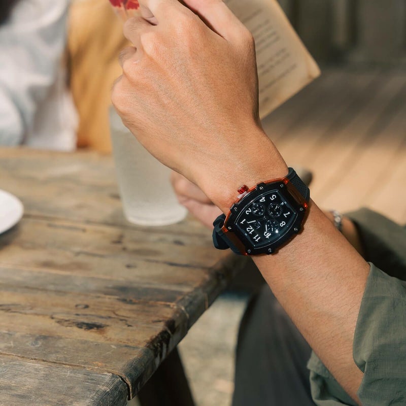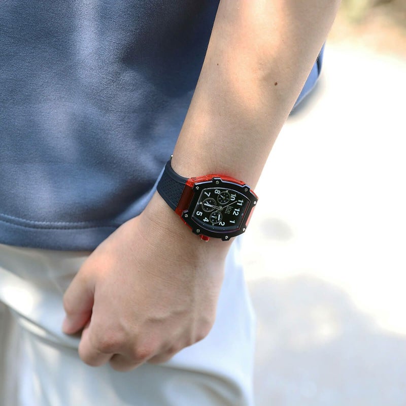 40mm×45.5mmのトノー型ケースには、軽量で傷にも強い素材のポリアミドプラスを採用。光沢を抑えたアルミニウムベゼルとステンレス製の8本のビスが、高級感と遊び心を演出する。日付表示、曜日表示、24時間計を備えた、マルチファンクションモデル。