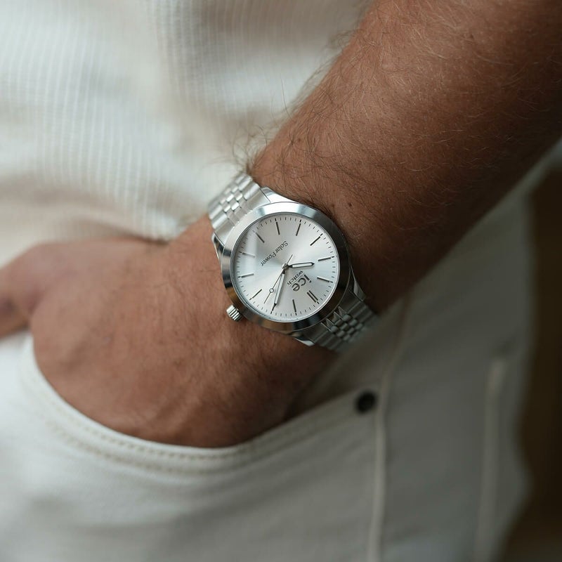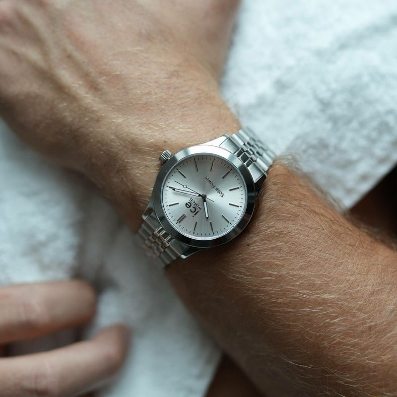 「アイススティールソーラー」は、太陽光や人工光を利用して充電ができる日本製のソーラームーブメントを搭載したソーラーウォッチ。長時間使用にも対応することができ、これまでにない利便性と環境への配慮を両立させています。ケース素材には高品質なステンレススチールを使用し、クリーンでシンプルなベゼルデザインが洗練された印象を与えます。ケース径34.5mmのスモールサイズ6種類と、40.5mmのミディアムサイズ5種類を揃え、全11種類の豊富なバリエーションを展開し、カジュアルからビジネスシーンまで、様々なスタイルにフィットする柔軟性を持っています。10気圧防水を備えており、普段使いはもちろん、アクティブシーンでも安心して着用が可能です。