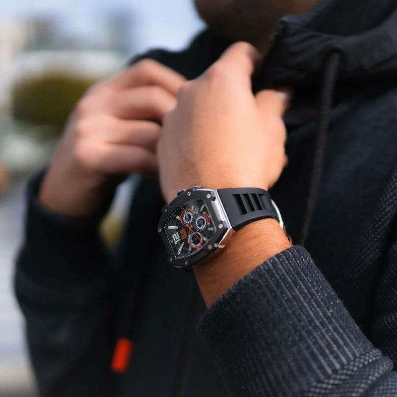 クロノグラフモデルはそれぞれ異なるダイヤルデザインが特徴で、カーボンファイバーダイヤルにオレンジのアクセントを効かせたアクティブな印象の「ブラックシルバー」、深みのあるブルーサンレイダイヤルが美しい「ブラックブルーシルバー」、ハニカムパターンとグレインテクスチャの組み合わせが視覚的にも楽しい「ブラックゴールド」の3種類。しなやかなシリコンラバーストラップは通気性を考慮したデザインで快適な装着感を実現。クロノグラフ機能(30分計、60分計)、24時間表示、日付表示を搭載し、10気圧防水性能を備えています。ムーブメントには日本製クォーツ「Miyota JS25」を採用しています。