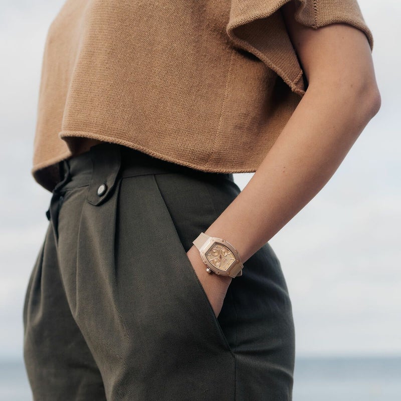 一目で印象に残る独特な“トノー型”のケースは、見事な曲線美を持ち、近年のファッションウォッチマーケットでは前例のない形状。軽量で絶妙な発色のアルミ製ケースはスチール製のネジで飾られ、奥行きのある文字盤には、スケルトンの針、日付・曜日・24時間計のサブダイアルを配し、日本製の多機能ムーブメント「Miyota 6P29」を搭載。シリコンラバーベルトは、しなやかで柔らかく、肌に心地よくフィットします。
