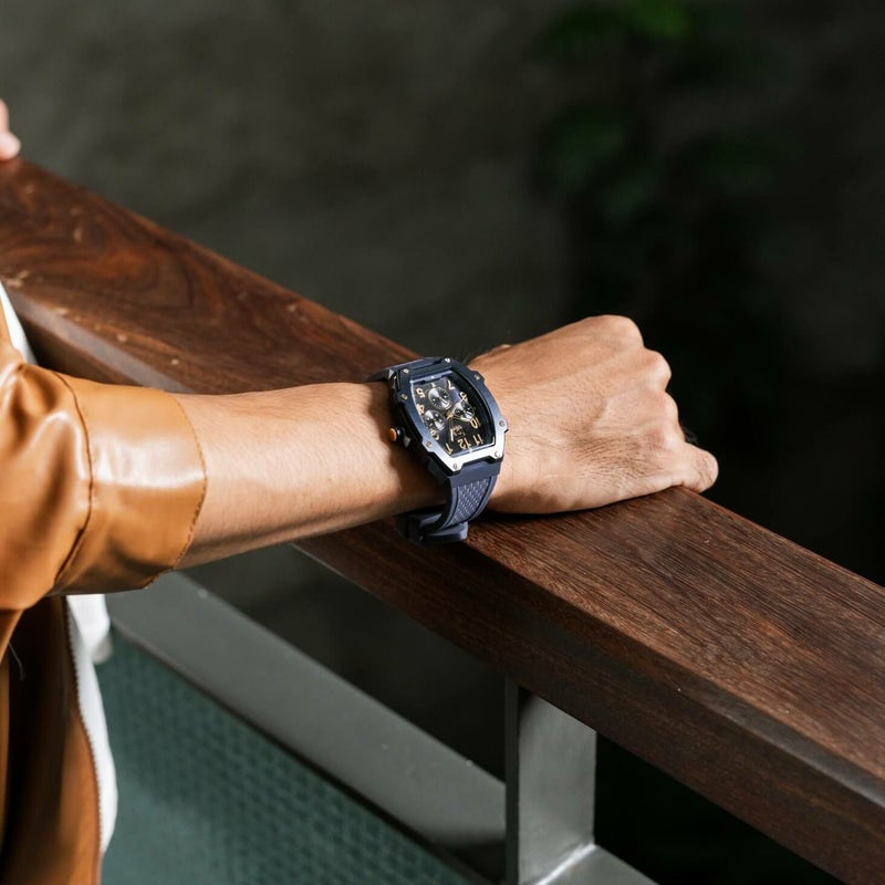 40mm×45.5mmのトノー型ケースには、軽量で傷にも強い素材のポリアミドプラスを採用。光沢を抑えたアルミニウムベゼルとステンレス製の8本のビスが、高級感と遊び心を演出する。日付表示、曜日表示、24時間計を備えた、マルチファンクションモデル。