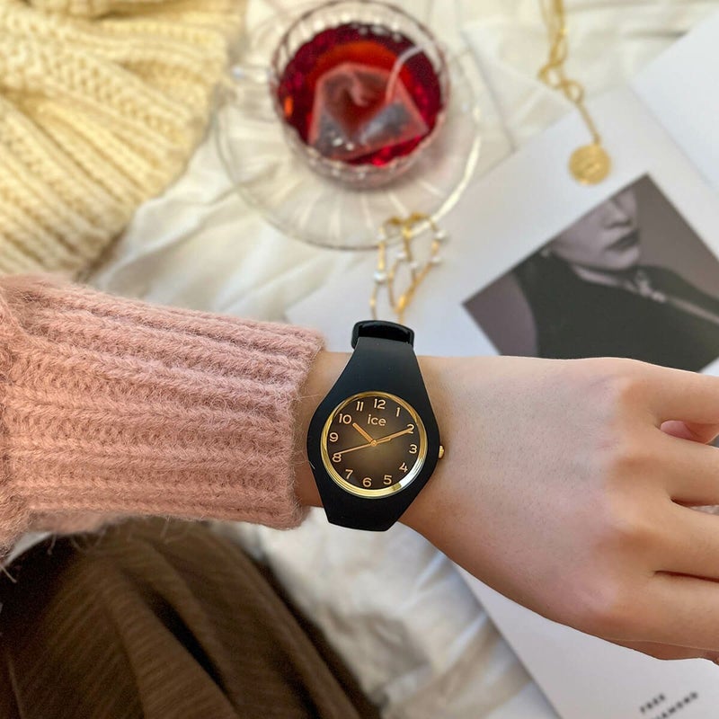 「アイス グラムシークレット(ICE glam secret)」は、秋の訪れを感じさせる深みのあるカラーリングとイエローゴールドの絶妙な組合せが最大の特徴。全体をシックなワントーンカラーでまとめ、文字盤には中央から外側へ向かう円形のサンレイグラデーションダイアルを採用。アラビア数字のインデックス、インナーリング、針、リューズ、バックルなどのステンレスパーツがイエローゴールドカラーで統一され、深みのあるカラーウォッチを上品な雰囲気に仕上げている。ケースとベルトが一体となったシリコンラバーベルトは、しなやかで柔らかく、肌に心地よくフィットする。ケース径37mmのスモールプラスサイズ。生活強化の10気圧防水。