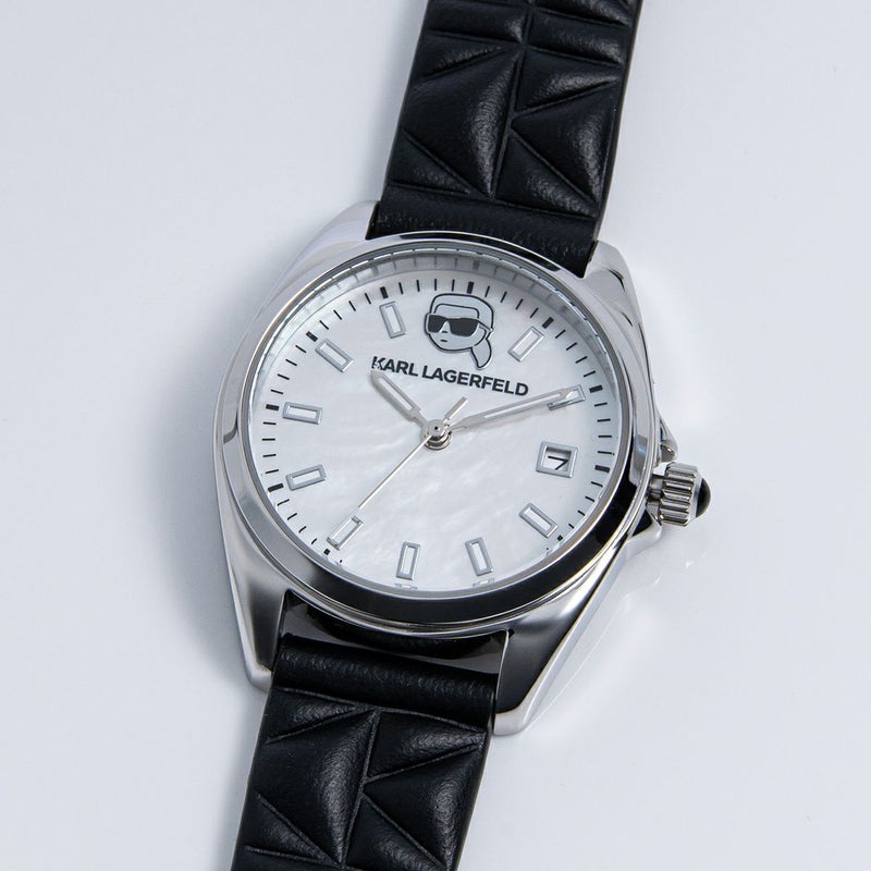 カール・ラガーフェルド ラウンド エッセンシャル - ホワイト MOP シルバー アイコン ダイヤル ブラック レザー