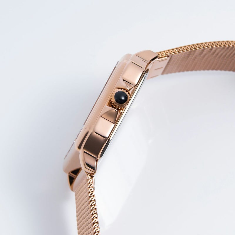 ホワイトマットのダイヤルを採用したスクエア型の腕時計。ブランドとして初採用となるメッシュベルトが、上品かつモダンな表情をプラスし、より洗練された印象に仕上がっています。