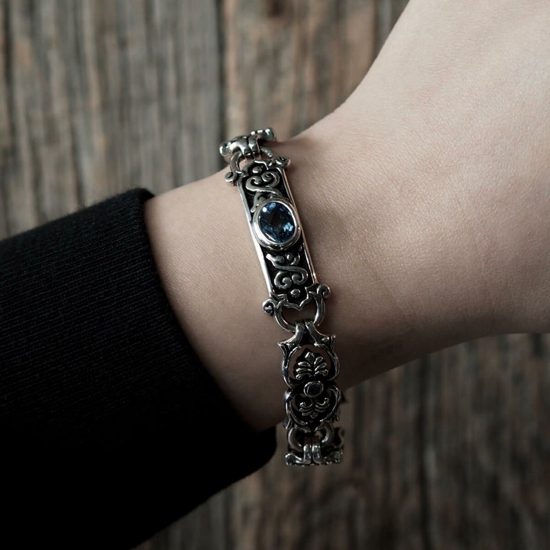 中世の北欧で豊穣を意味するブドウの蔦や葉をモチーフに、着用感を重視し程よいボリューム感でデザインされたブレスレット。リンクパーツの中央にはアクセントとなるブルートパーズが留められており、腕元に爽やかな透明感を与えてくれる。