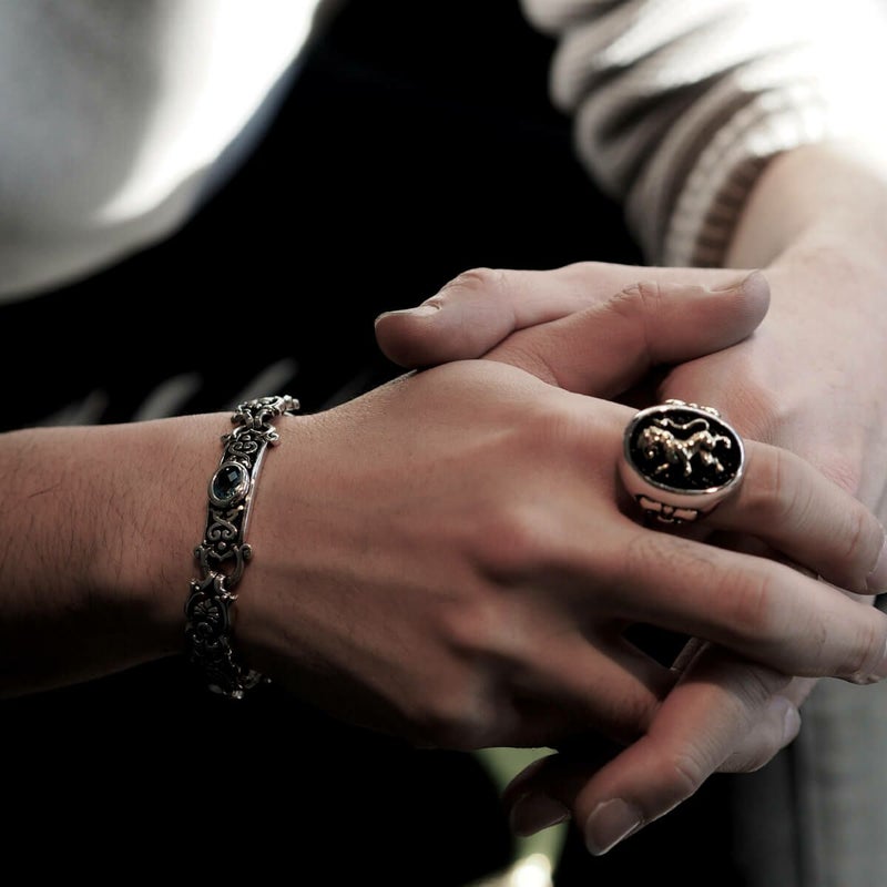 中世の北欧で豊穣を意味するブドウの蔦や葉をモチーフに、着用感を重視し程よいボリューム感でデザインされたブレスレット。リンクパーツの中央にはブルートパーズが大小3石ずつ留められており、腕元に爽やかな透明感を与えてくれる。