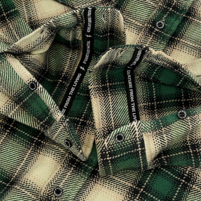ケニー氏が厳選したヴィンテージのブランケットシャツをカスタムベースとして使用し、ライニングの一部箇所にはCREATURE TAPEを施しボタンもC.F.T.L.オリジナルへと変更した、1点ずつ異なる様々な風合いを見せる作品として13枚限定にて発売いたします。