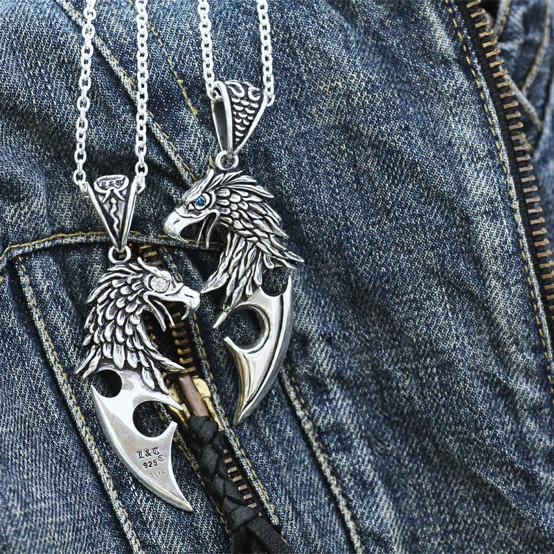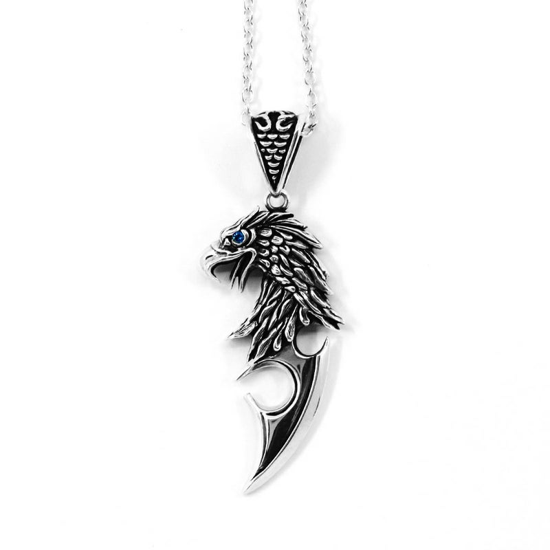 白頭鷲の凛々しい横顔と、バトルナイフのデザインを融合したペンダント。鷲の両目にセットされた鮮やかな青いダイヤモンドが爽やかな雰囲気を奏でつつ、シャープで男性的な存在感を引き立たせてくれるアイテムです。