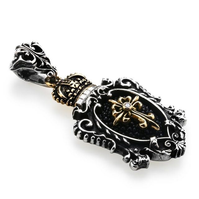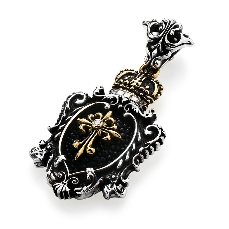 王族が掲げる紋章に王冠を組み合わせてデザインされた、ブランドを代表するインレイ技法のペンダント。王冠と中央のクロスにゴールドとダイヤモンドを加えたことで、アンティークジュエリーのような作品に仕上がっている。