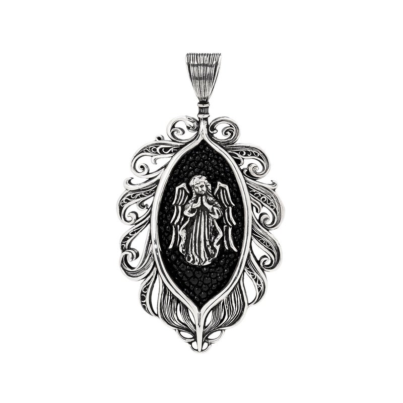 中央には祈りを捧げる天使の姿がデザインされており、着用するものに神のご加護が訪れますようにという願いが込められている。