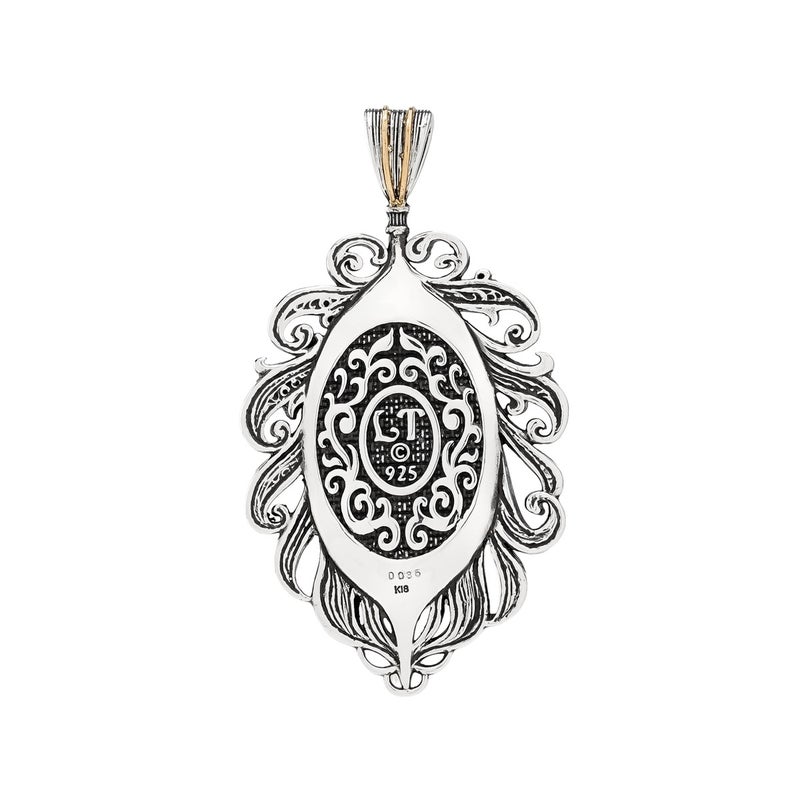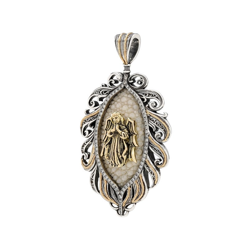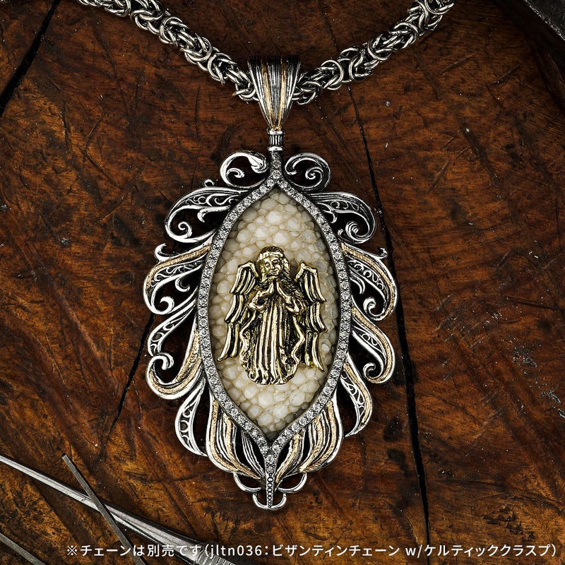 LTならではのインレイ技法が持つ迫力と存在感のあるデザインを、天使から舞い降りた羽根に抱擁される姿を表現した繊細さと優雅さを併せ持つアイテムとして制作されたペンダント。