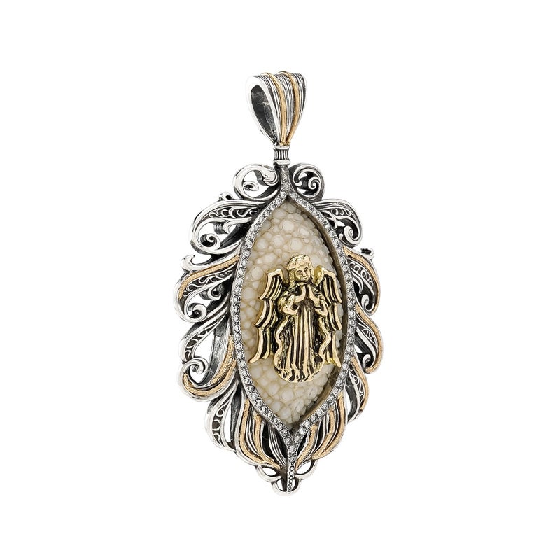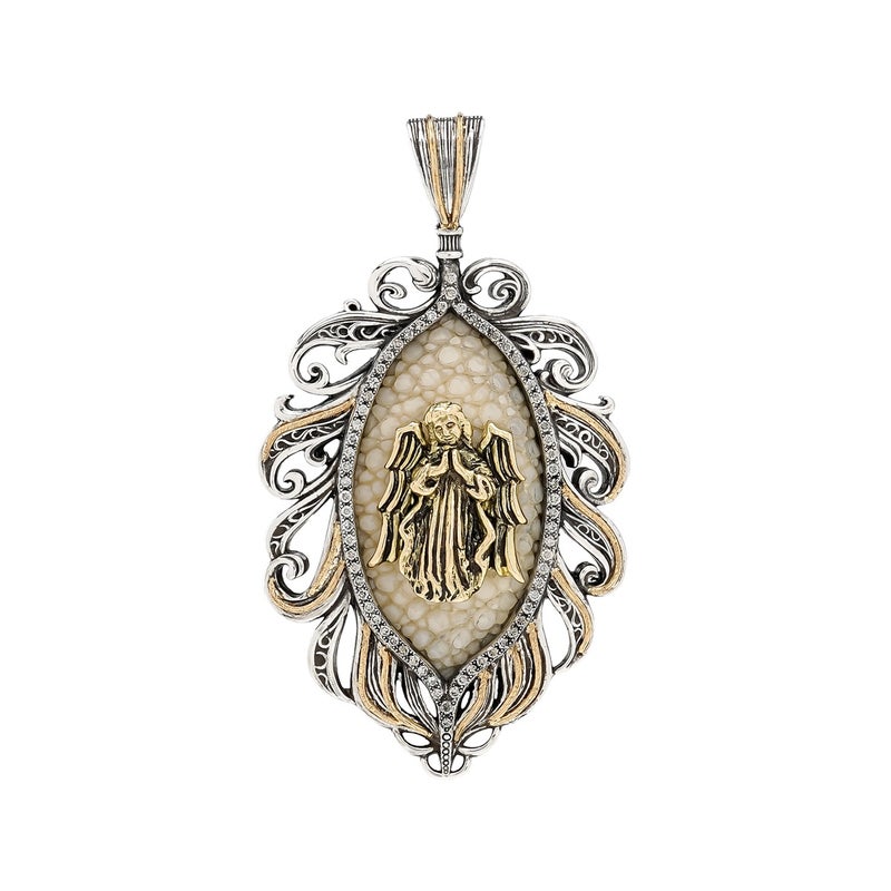 中央には祈りを捧げる天使の姿がデザインされており、着用するものに神のご加護が訪れますようにという願いが込められている。