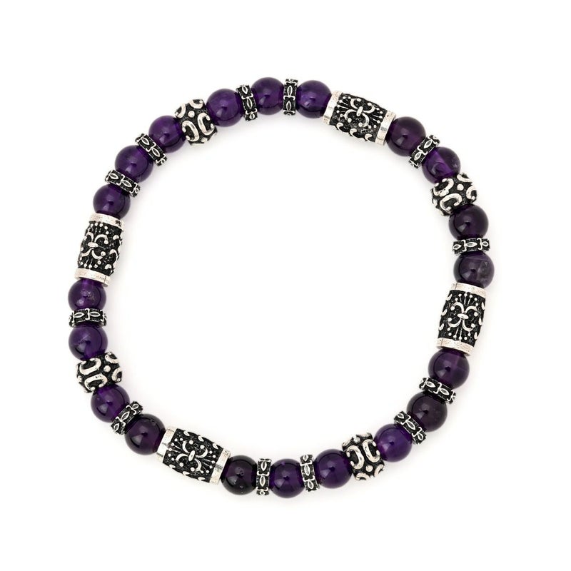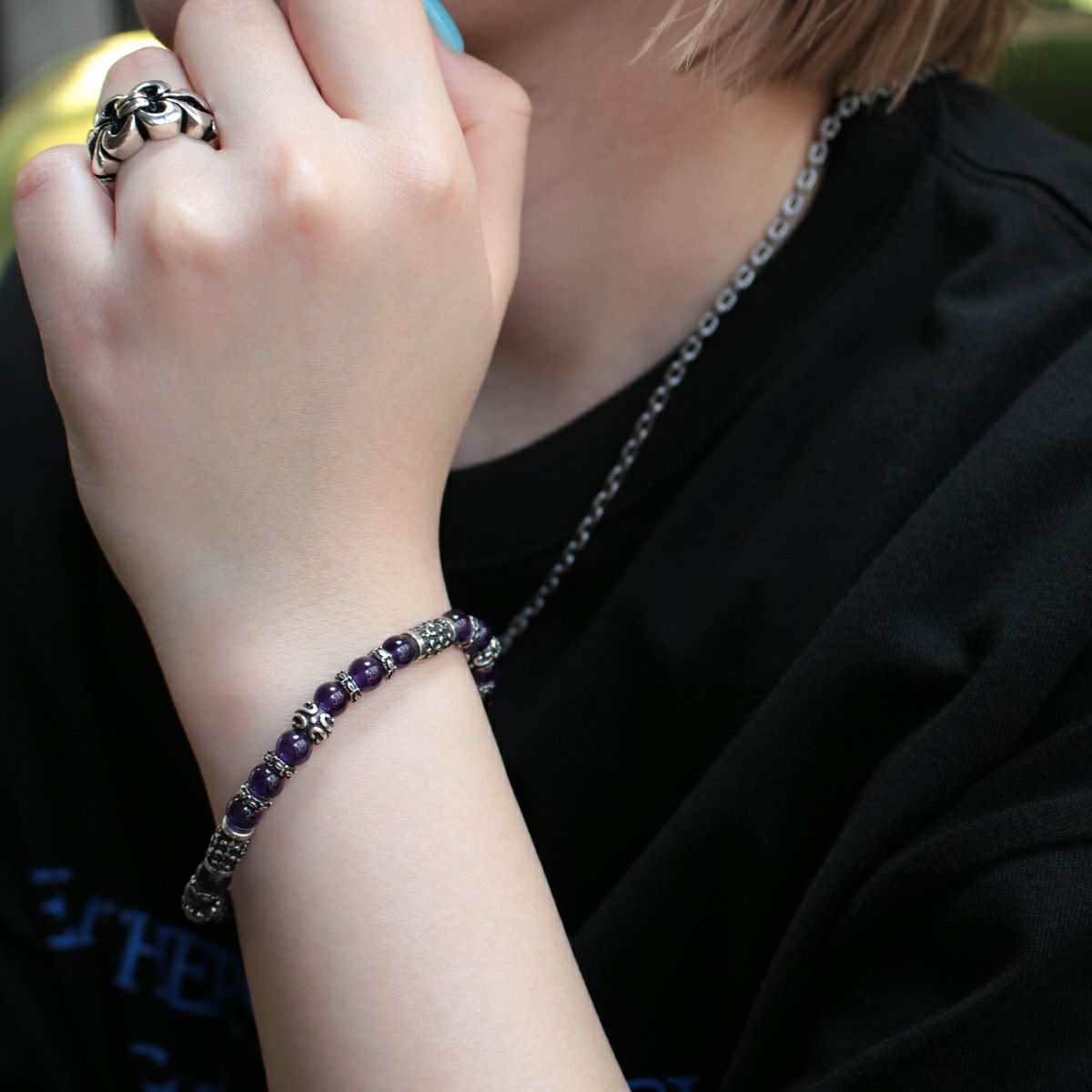 小振りサイズのシルバービーズに心を落ち着かせると言われるアメシストを組み合わせた、腕元のアクセントとして使いやすい6mm幅のストーンブレスレット。