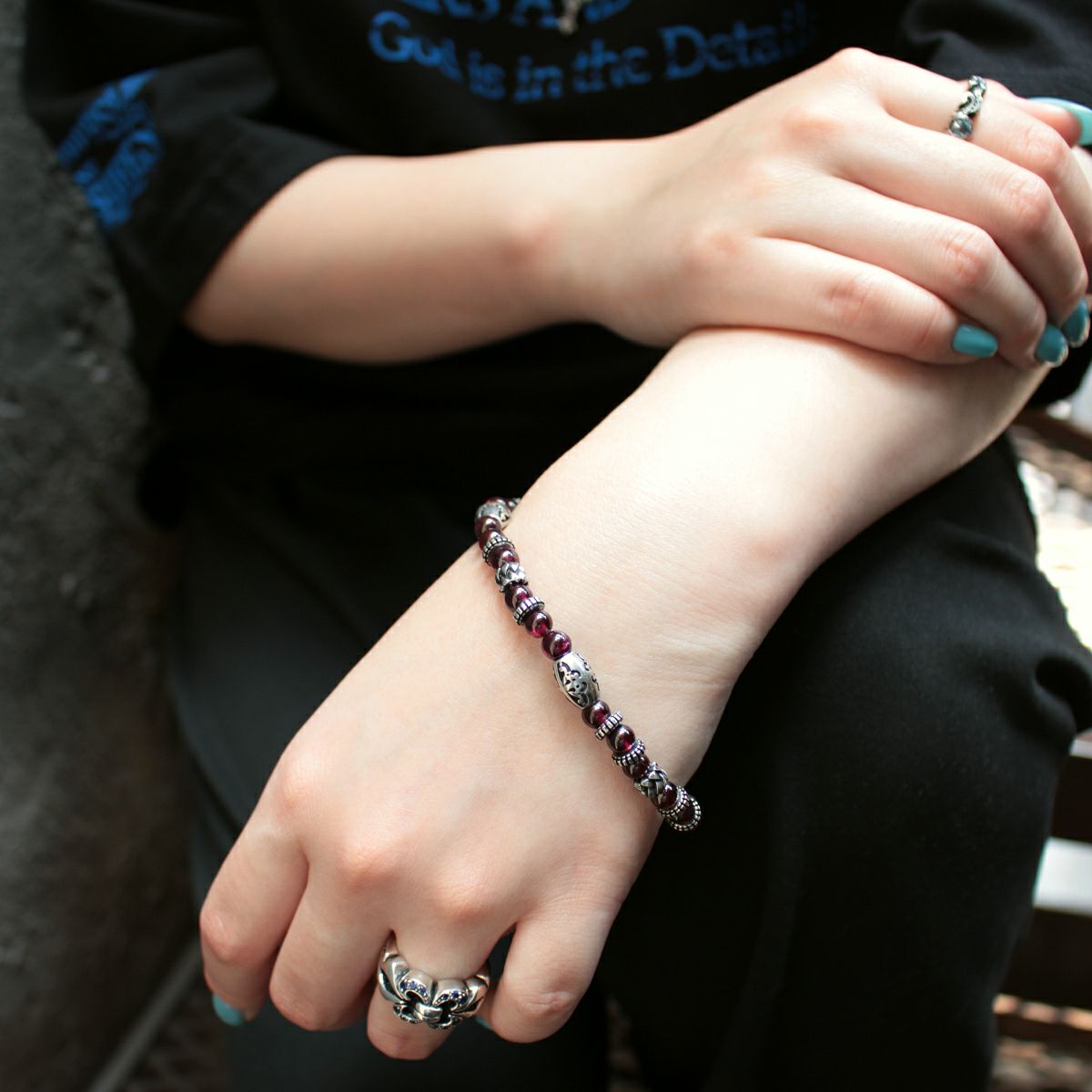 小振りサイズのシルバービーズに大切な人との絆を深めると言われるガーネットを組み合わせた、腕元のアクセントとして使いやすい6mm幅のストーンブレスレット。