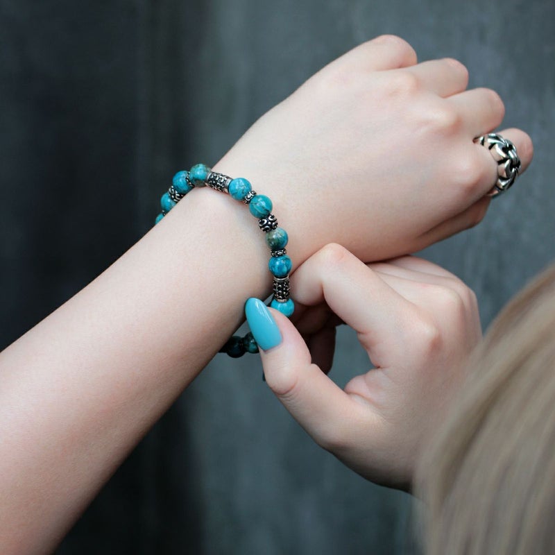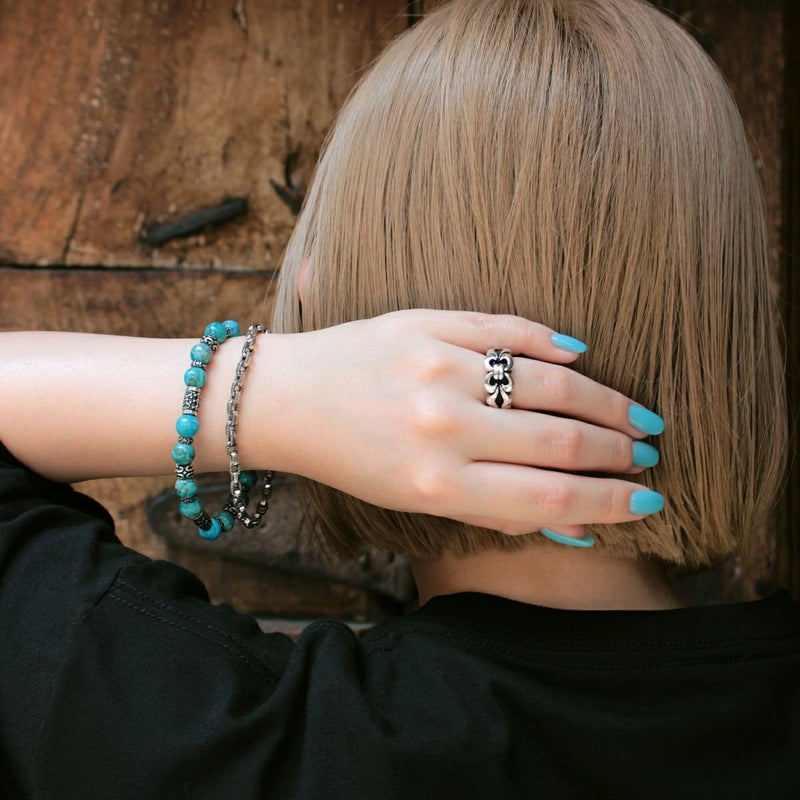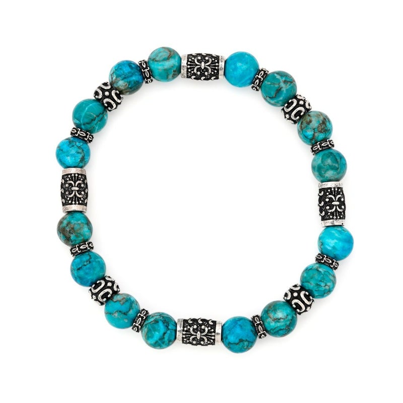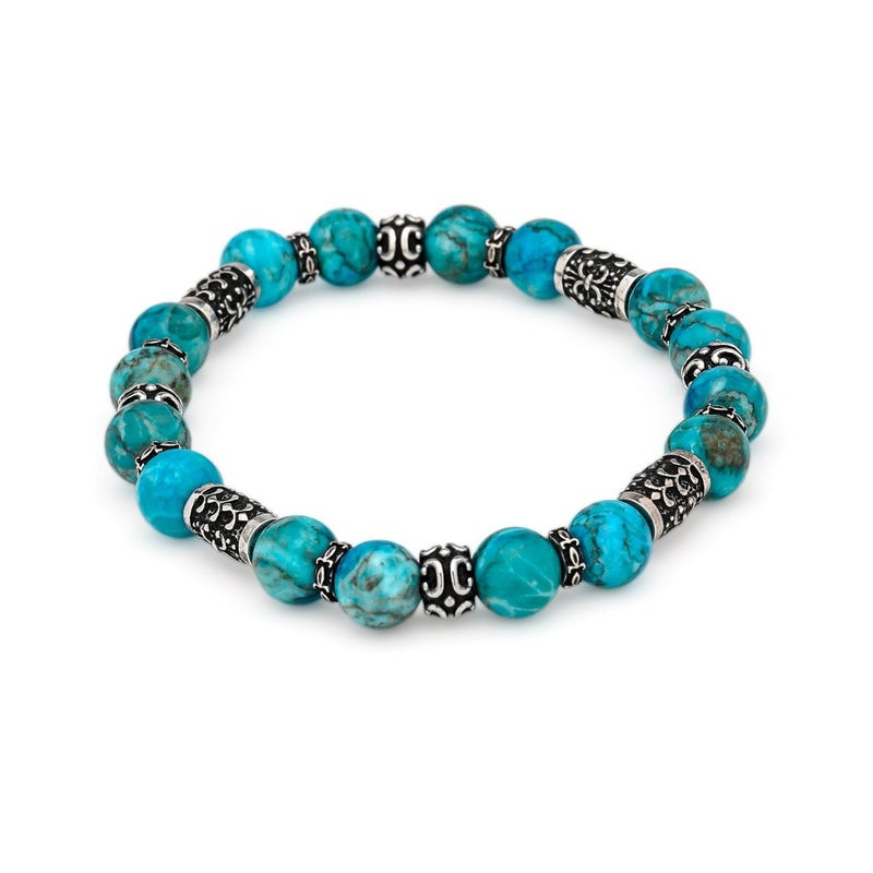 小振りサイズのシルバービーズに幸運を呼ぶ聖なる石と言われるターコイズを組み合わせた、腕元に程よい存在感を与えてくれる8mm幅のストーンブレスレット。