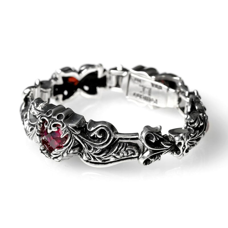大振りのハートにスクロール柄を組み合わせ、バロック様式の世界観で再現したブレスレットです。アイテム全体に留められたガーネットは、色鮮やかにその存在感を引き立たせている。