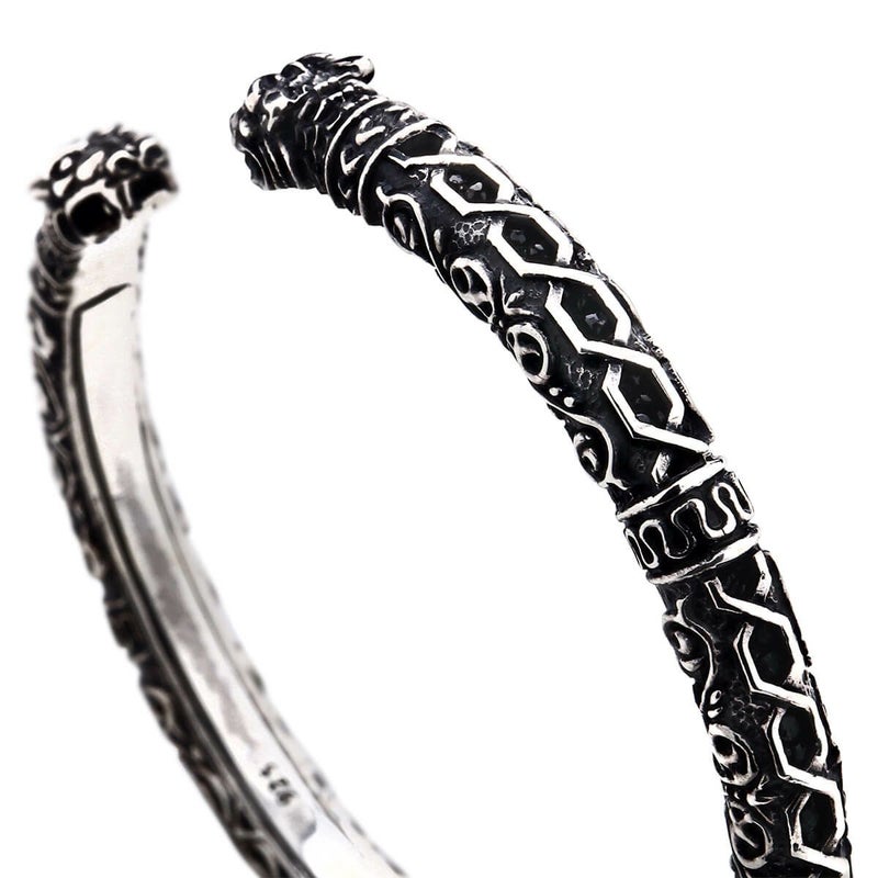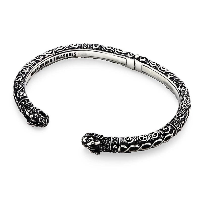 レザーズ&トレジャーズで定評のあるケルティックタイガーをデザインモチーフとして作られた、ブランドとして初めてのシルバーバングルを用いたバングルスプリング(バネ)を用いた着脱しやすいプロダクトデザイン。ジャパンメイドの技術の高さを生かし、サイドデザインの透かしの中にスティングレイを込め、レザーズトレジャーズでしか作る事ができない完全立体のデザインで奥行きのある表情を見せます。細部にまでこだわり抜き完成された一点となりました。サイズ展開はシルバーボリュームを持たせた2サイズ(JLTB058、JLTB059)を用意し、ゴールドカスタム、ストーンアイズ、レザーのカスタムオーダーが可能です。