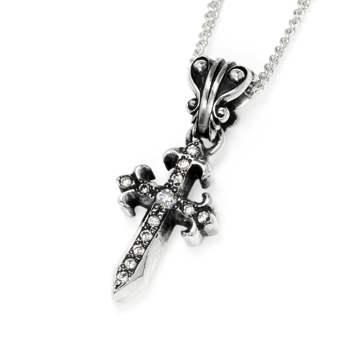 クロス下部が剣先のようになっている、デザイナーの名を冠したクロスペンダント。