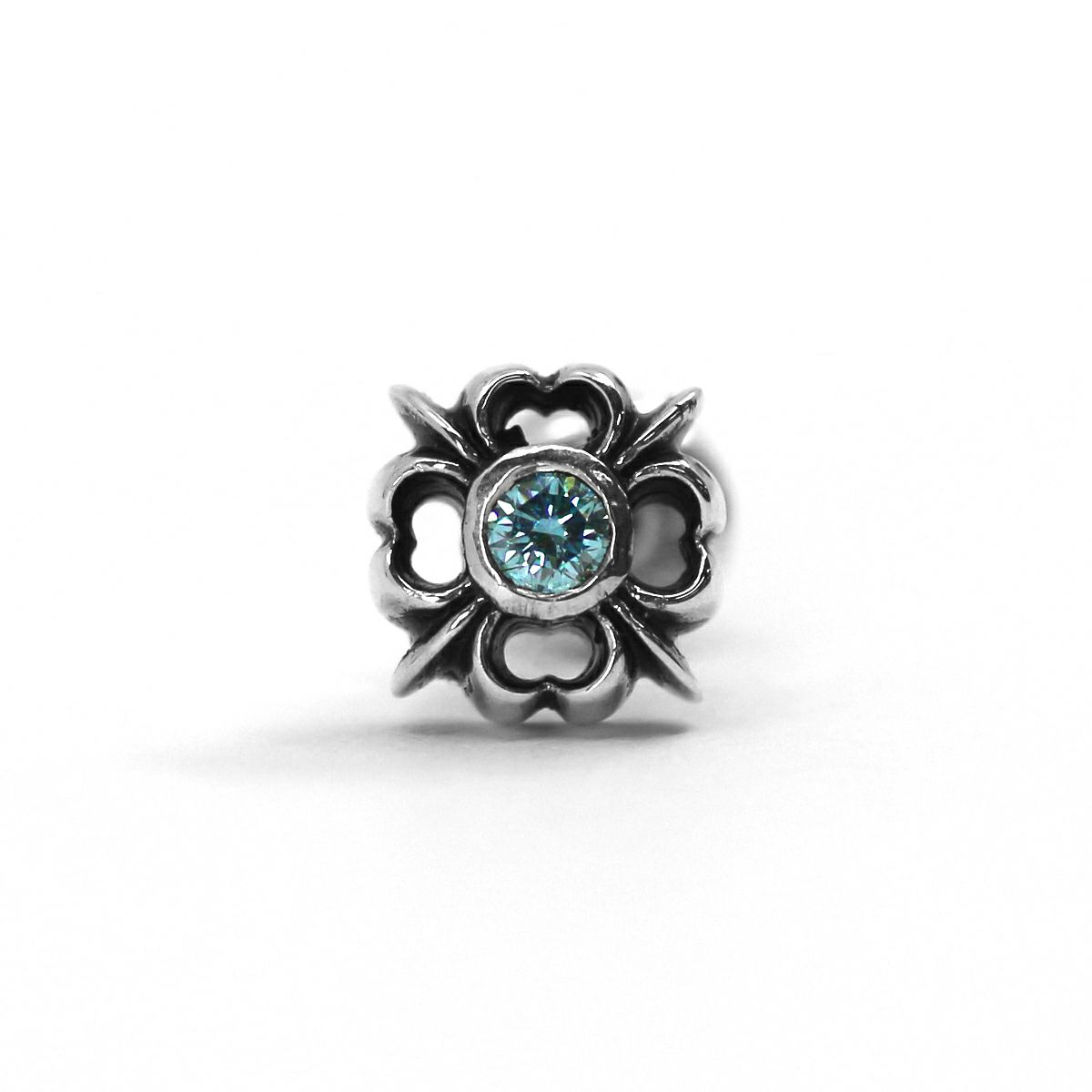 シンプルさを重視してデザインされた小振りの十字架は、中央に留められた天然石がワンポイントのアクセントになる人気アイテム。透き通った輝きのあるアイスブルーダイヤモンド。耳元を涼しげに表現してくれる。