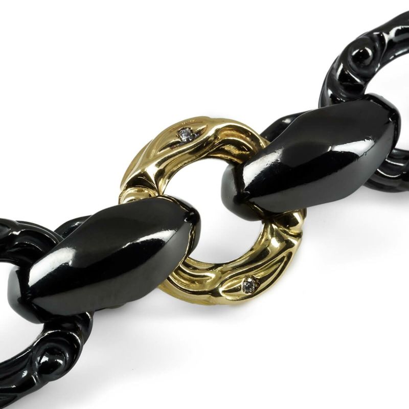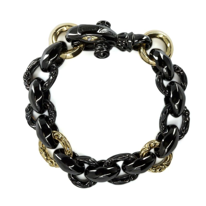 ブランドが誇るシルクリンクパーツの輝きと、彫りの入ったサークルが連結されたボリューム・デザイン共に非の打ち所の無いブレスレット。圧倒的な存在感と着け心地の良さは体感して納得出来る。ブラックコートに部分的なパーツをゴールドにし、クラスプ部にはダイヤモンドをセットしたフルカスタムブレスレット。