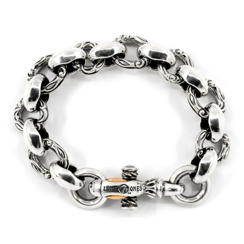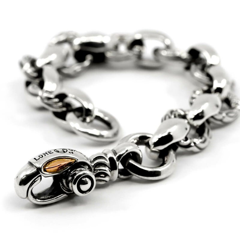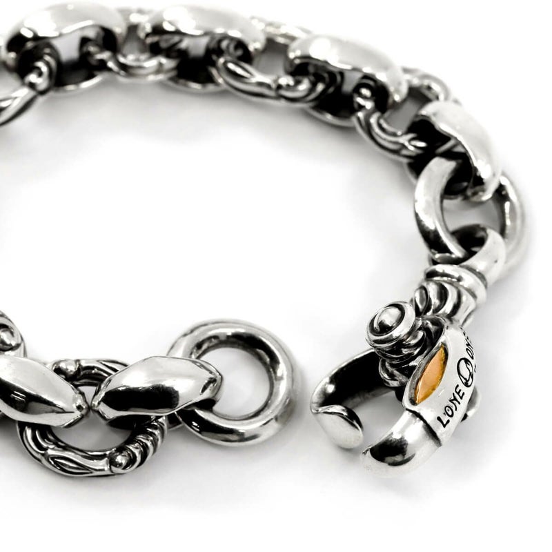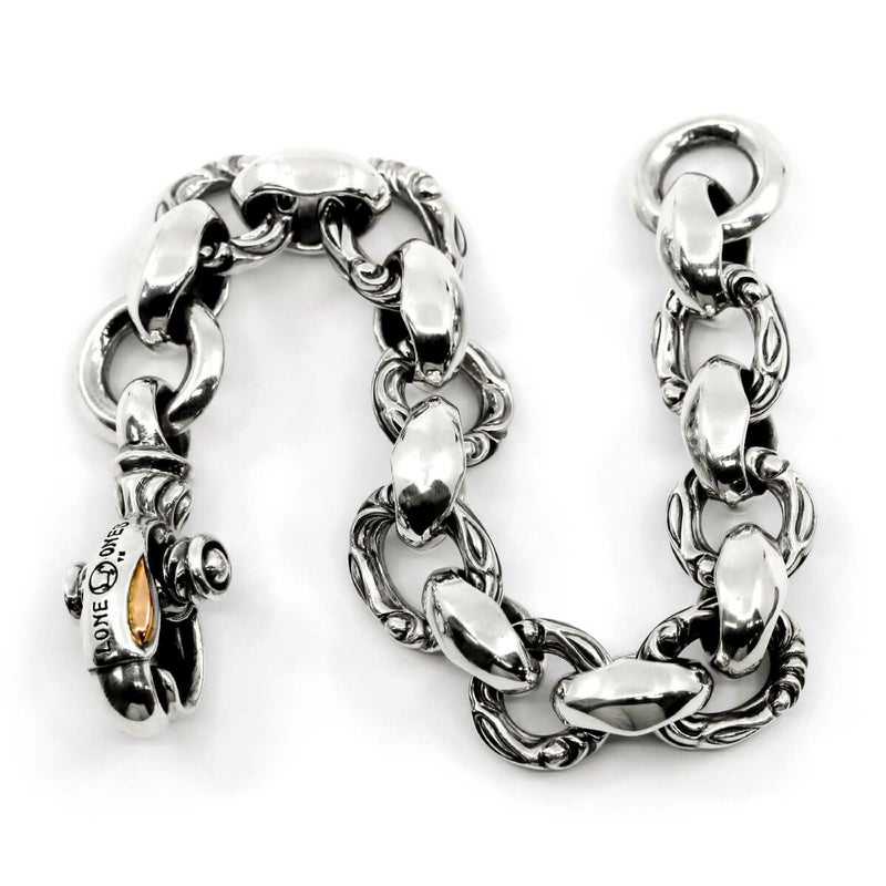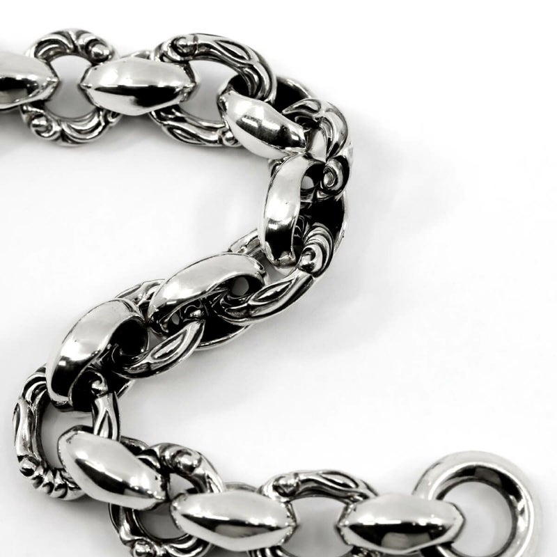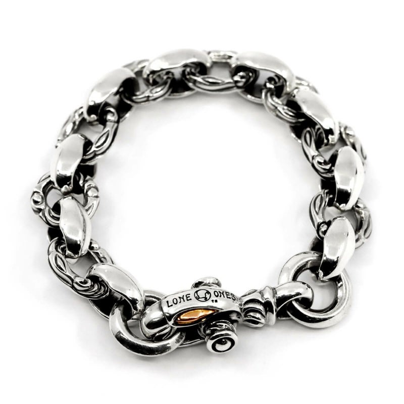 ブランドが誇るシルクリンクパーツの輝きと、彫りの入ったサークルが連結されたボリューム・デザイン共に非の打ち所の無いブレスレット。圧倒的な存在感と着け心地の良さは体感して納得出来る。クラスプ部の鳥の目部分をローズゴールドで仕上げたハイランクモデル。