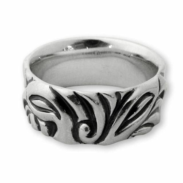 2羽の鳥が左右対称に落とし込まれたデザインが特徴的。幅は広めだが厚みを薄くしているので軽やかな着け心地を楽しめる。