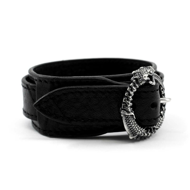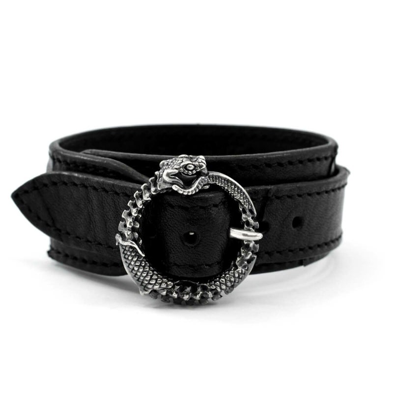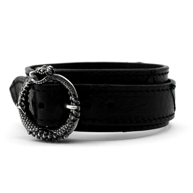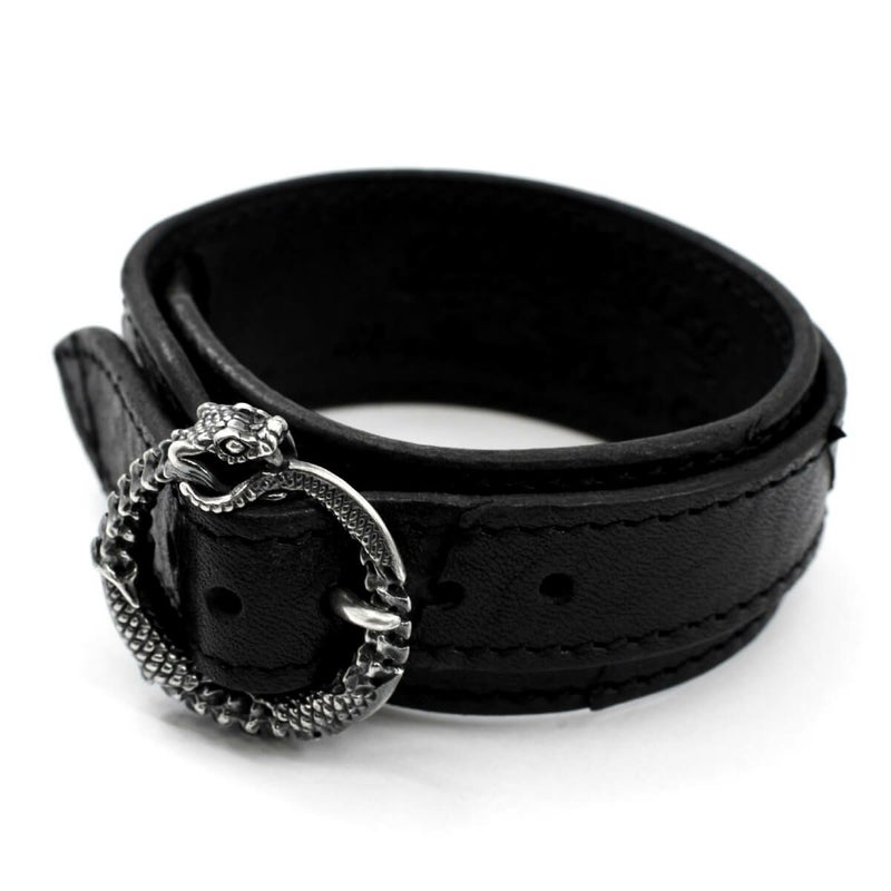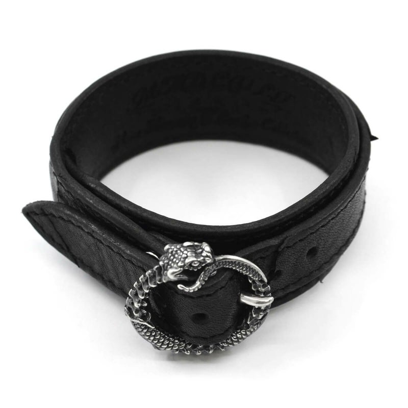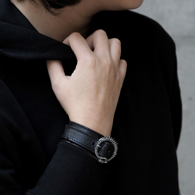 朽ちてもなお自身の尾を咥え続ける、死と再生を意味するウロボロスの姿をバックルに用いたレザーブレス。好みに応じて左右の向きが異なる2パターンで展開している。